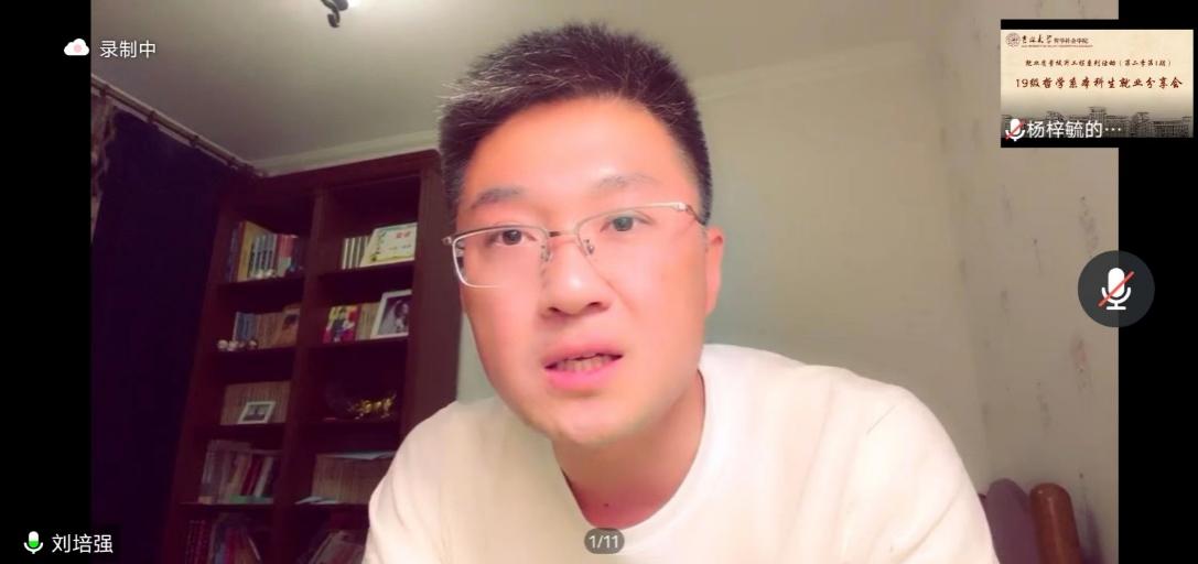 2022年5月29日晚,我院举办就业质量提升工程系列讲座第二季第1期,哲学社会学院哲学系各位老师、学院党委副书记兼副院长刘培强老师以及2019级、2020级哲学专业的本科生参加了班会。班会有由本科生班主任哲学系田冠浩教授主持。