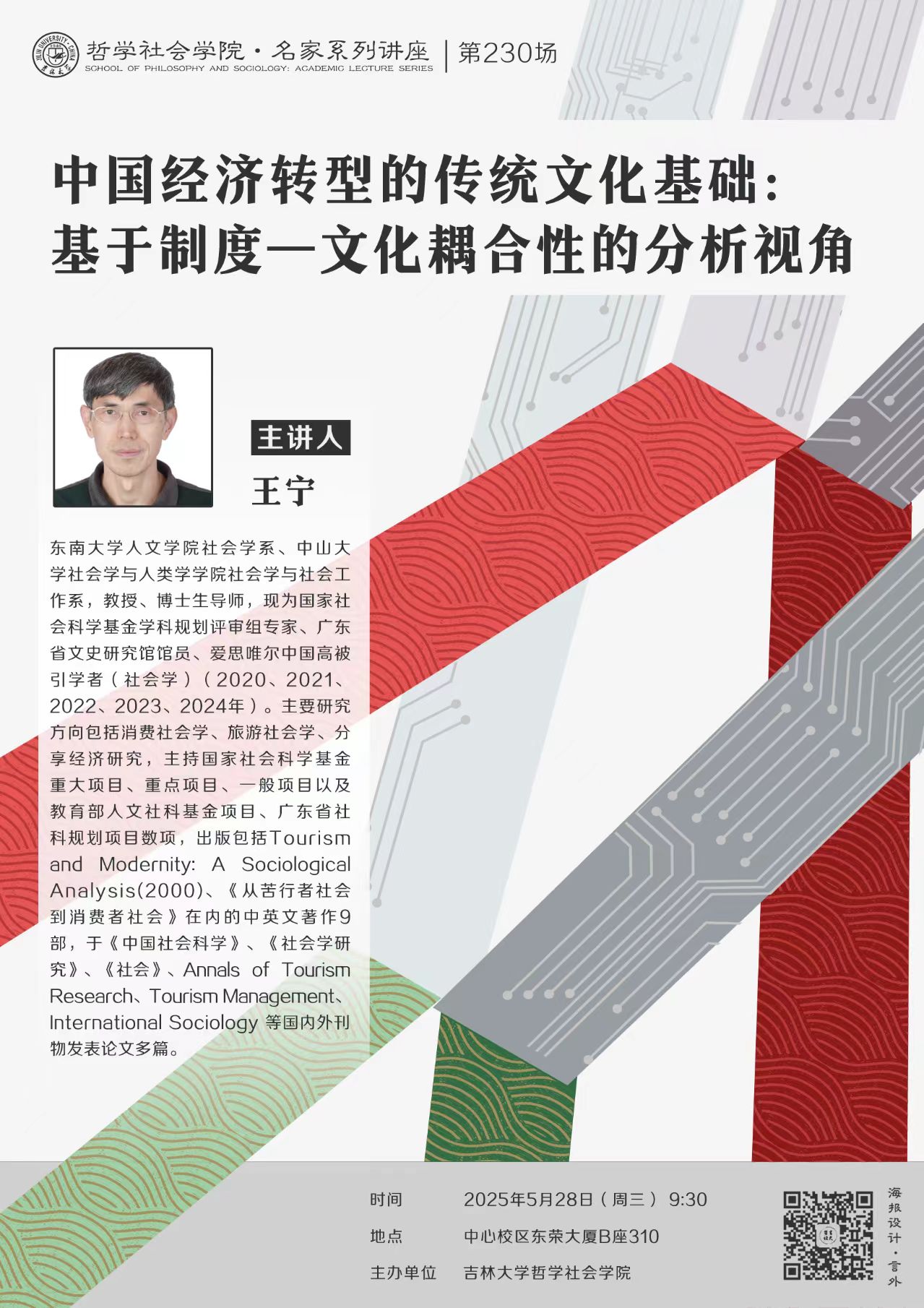 【哲学社会学院名家系列讲座第230场】王宁:中国经济转型的传统文化基础:基于制度—文化耦合性的分析视角