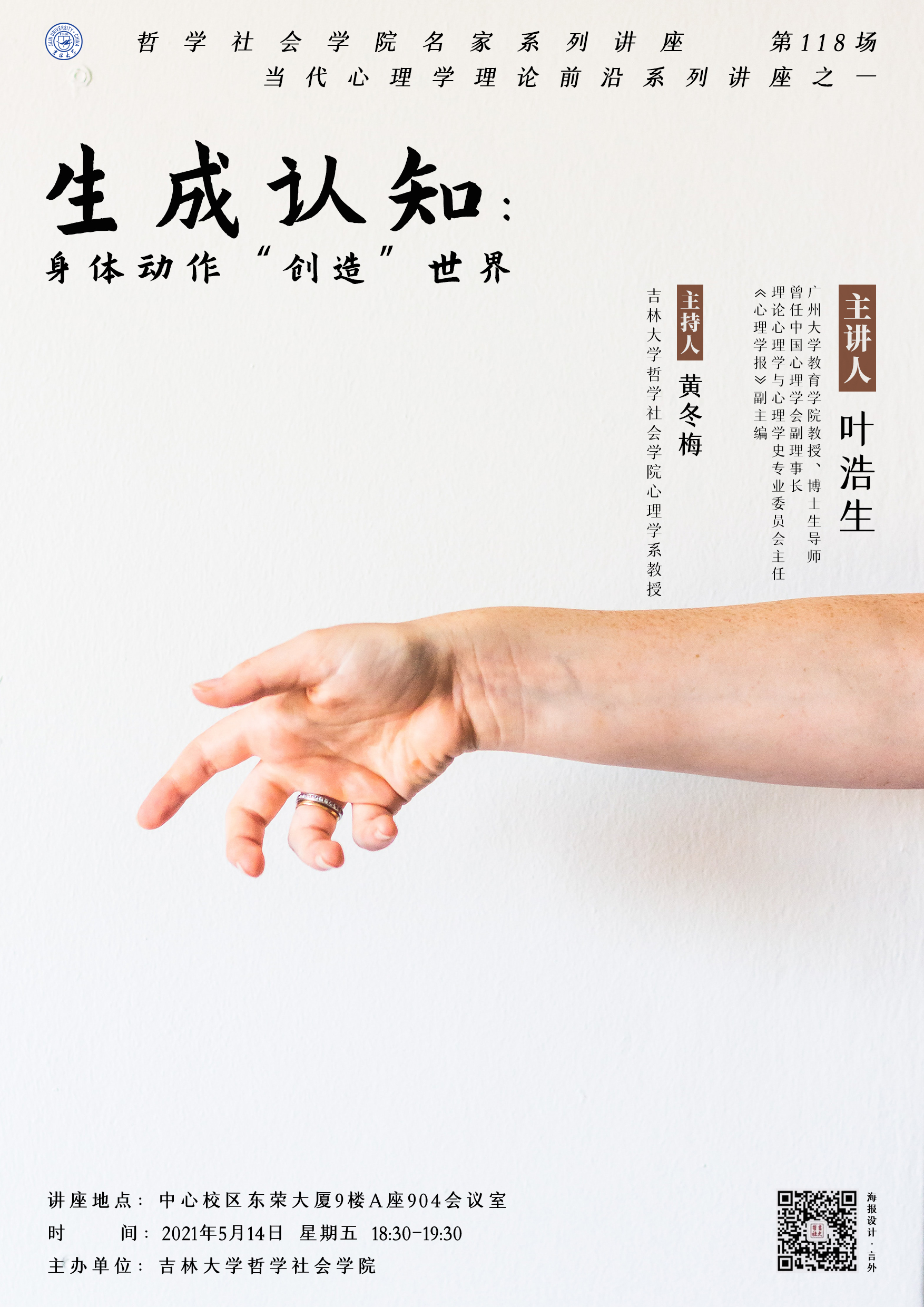 【哲学社会学院名家系列讲座第118场】【当代心理学理论前沿系列讲座之一】叶浩生:生成认知:身体动作“创造”世界