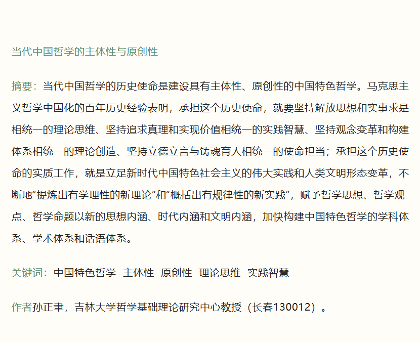 著名哲学家、教育家,国家哲学社会科学专家咨询委员会委员、教育部社会科学委员会委员、教育部习近平新时代中国特色社会主义思想研究中心专家委员会顾问,吉林大学哲学社会科学资深教授孙正聿,在《中国社会科学》2022年第3期发表《当代中国哲学的主体性与原创性》,系统论证了当代中国哲学的历史使命是建设具有主体性、原创性的中国特色哲学。