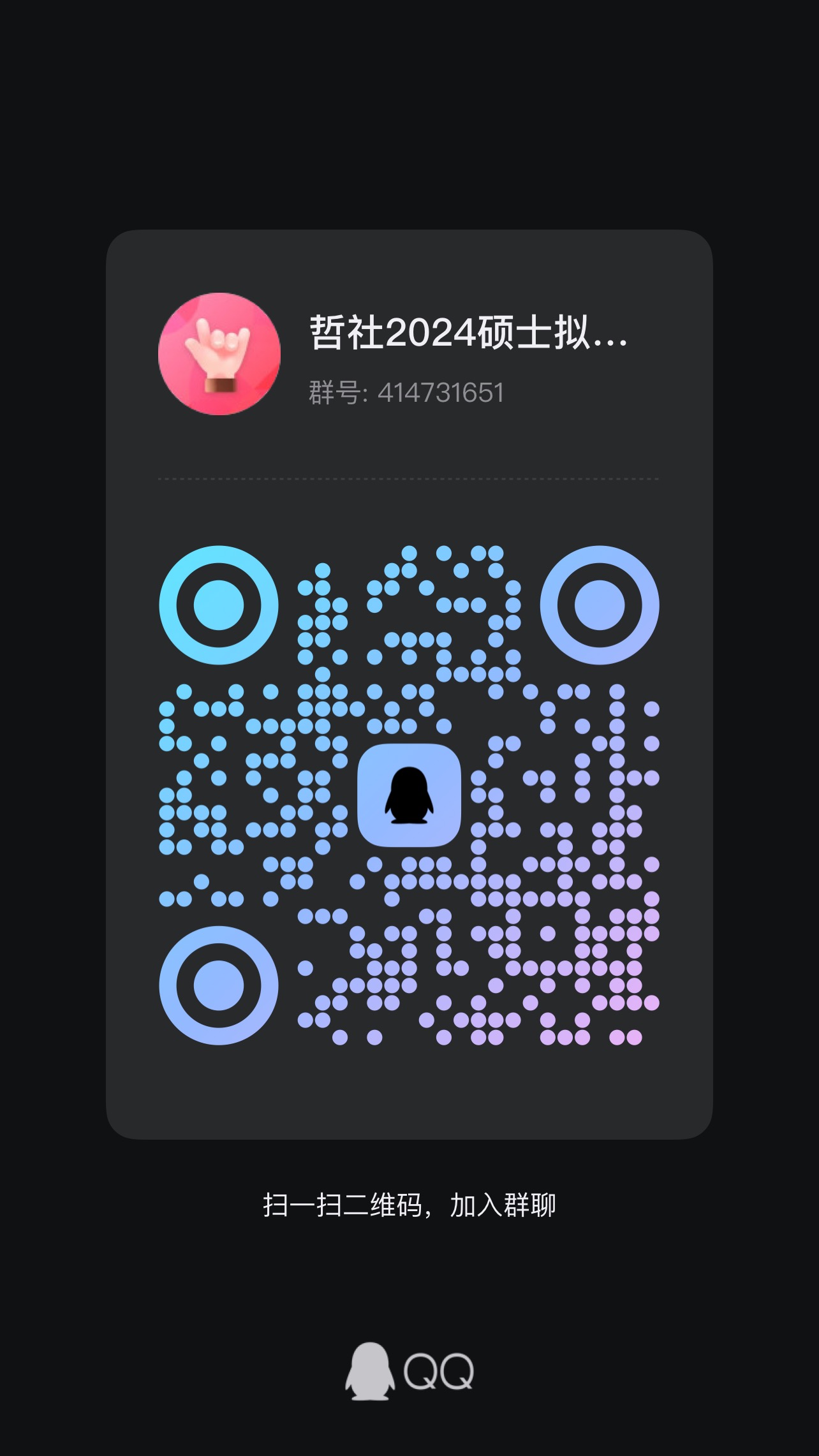 请拟录取考生尽快加入硕士拟录取QQ群414731651(二维码见下方图片),入群申请为“姓名-报考专业-身份证后四位”,后续调档、录取等相关通知将在QQ群内发布(不在学院主页发布,望周知!),请拟录取考生务必于2024年4月7日上午10:00前入群,并及时查看群内通知。