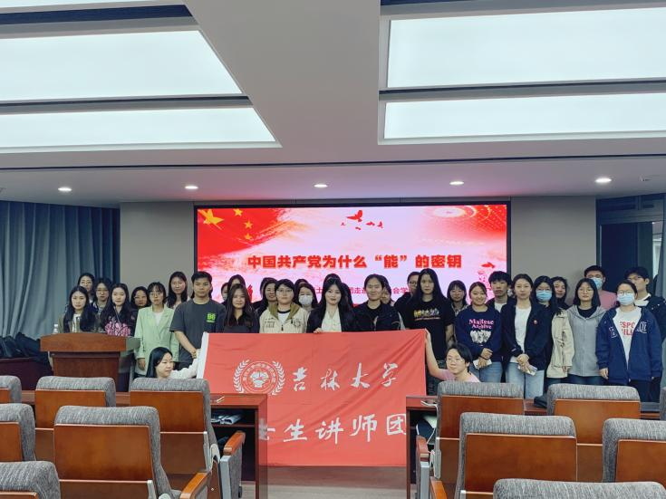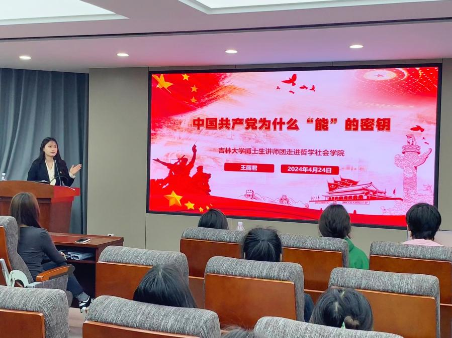 为深入学习宣传贯彻全国两会精神,充分发挥博士生讲师团理论宣讲作用,2024年4月24日18点,吉林大学博士生讲师团讲师王丽君走进哲学社会学院开展“学习贯彻两会精神 聚力中国式现代化”宣讲系列活动。此次宣讲的题目是“中国共产党为什么‘能’的密钥”,哲学社会学院研究生辅导员于洋老师、各党支部党员、研究生会全体成员及研究生干部代表参加本次活动。