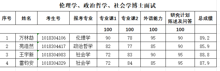 经我院组织专家组审查和复试考核,现将吉林大学哲学社会学院2024年伦理学、政治哲学、社会学专业博士面试成绩予以公示,公示期为2024年5月21日至2024年5月23日。如有异议,请于公示期内向我院反映。