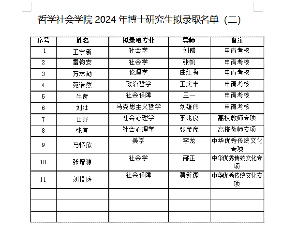 根据教育部及《吉林大学2024年博士研究生招生简章及专业目录》的相关规定,经过我院组织专家组审查和考核,现对哲学社会学院各专项及补录博士招生拟录取名单予以公示。