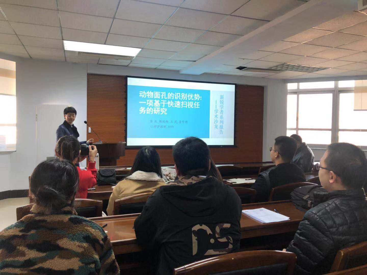 2019 年 11 月 3 日上午九点,由哲学社会学院和哲学基础理论研究中心主办的新锐学者系列讲座在东荣大厦 A904 举行。本次报告由吉林大学哲学社会学院心理学在读硕士研究生韩瑞卿主讲,主题为:“动物面孔的识别优势: 一项基于快速扫视任务的研究”。主评论人为吉林大学哲学社会学院硕士生导师黎兵老师,对本次报告主题感兴趣的老师和同学参加了本次报告会。