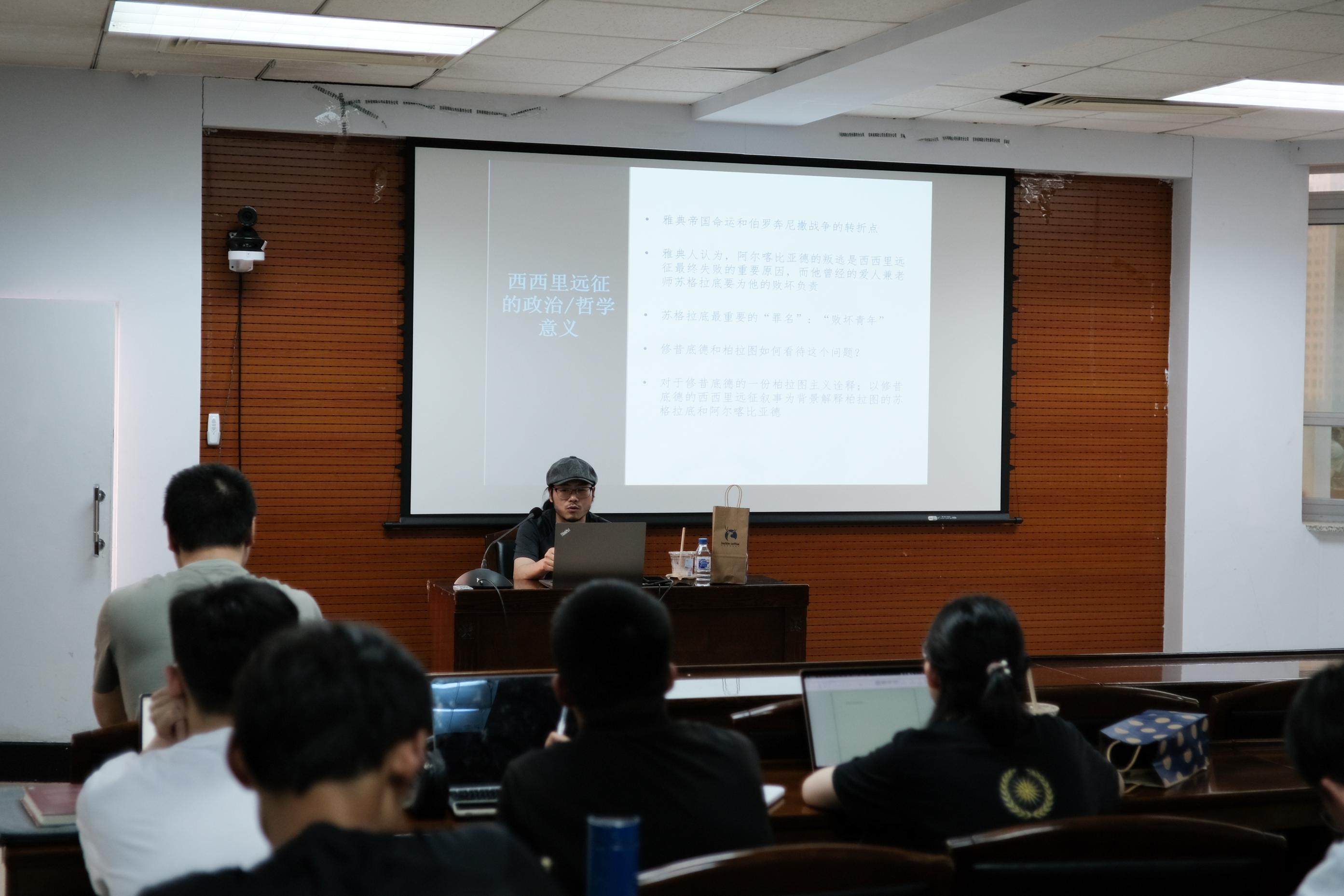 在两个多小时的讲座及讨论中,陈斯一老师以柏拉图哲学的血气和爱欲概念为解释框架,精彩地介绍了苏格拉底与阿尔喀比亚德的政治悲剧,使大家深入理解了这一对重要概念,并启发了对西西里远征和苏格拉底审判的思考。在交流讨论环节,陈斯一老师认真回应我校师生提问,解答疑惑,大家受益匪浅,讲座在热烈的掌声中完满结束。