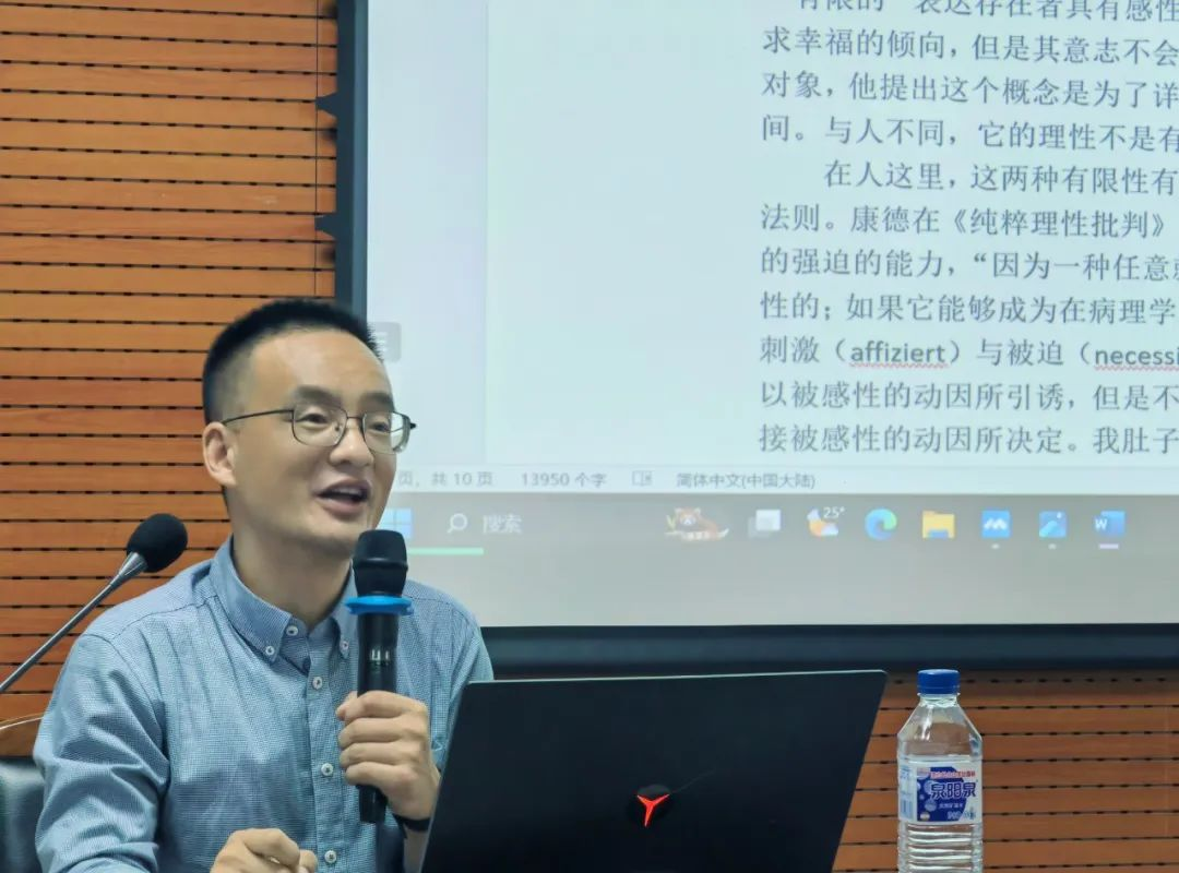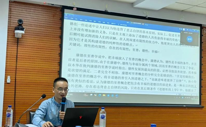 第三,至善概念的内在结构。刘作老师批评了黑格尔对康德道德哲学的误读,指出康德在世时就通过与伽尔韦等人的论争来对其道德哲学当中的形式主义问题进行过回应。康德道德学说与经验主义伦理学的根本区别在于,前者不是关于我们如何获得幸福的学说,而是教导我们如何配享幸福的学说。刘作老师进一步介绍了克勒梅、巴德尔、F.马尔温德、克兰盖尔德等国外学者的观点。刘作老师的讲解条理清晰、思路流畅,引领听众们充分思考康德道德哲学当中人的双重有限性与道德纯粹性之间的张力问题。在刘作老师严谨专业的讲解中,讲座很快接近尾声。韩志伟、陈士聪、刘李三位老师就他们各自关心的问题与刘作老师进行了热烈的对谈。与会老师同学踊跃提问,刘老师一一给予了耐心细致的回应。