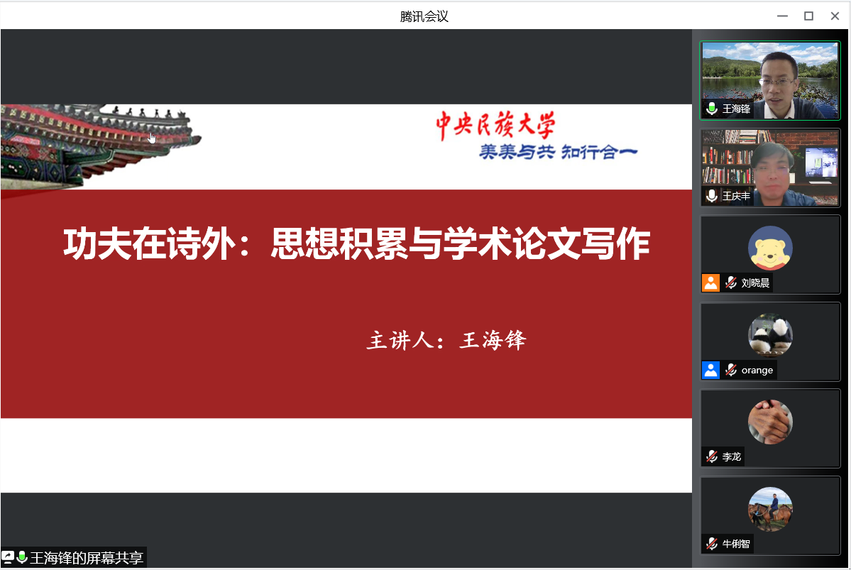 2022年4月18日晚,中央民族大学哲学与宗教学学院教授、博士生导师王海锋应邀做吉林大学哲学社会学院名家系列讲座(第153场)。讲座题为“功夫在诗外:思想积累与学术论文写作”。本次讲座以线上腾讯会议形式举办,由吉林大学哲学社会学院教授、博士生导师王庆丰教授主持。