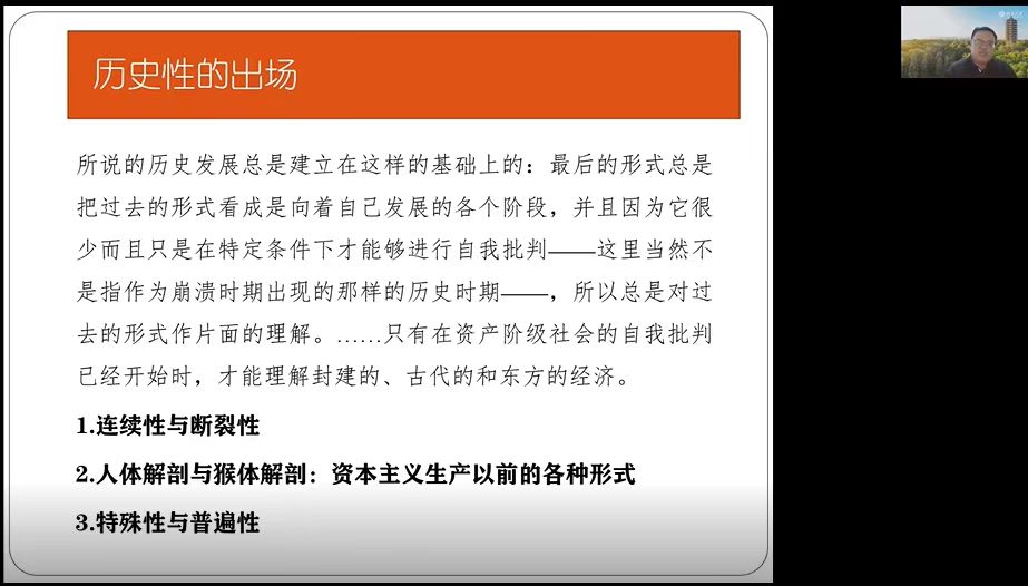 讲座最后,张梧老师以对“《资本论》历史唯物主义的意蕴”的简要阐述作为结束,向大家列举了“历史唯物主义不是历史主义”“从历史到历史性”“历史性的出场意味着全部自然法学说的终结”“历史性分析与知识社会学有本质区别”“资产阶级的自我批判是首要批判”“资本逻辑批判是唯物史观的逻辑前提”“历史唯物主义的两个版本”“历史唯物主义不是知性(实证)科学”“《德意志意识形态》与《资本论》并不对立”九个值得深入研究的问题。