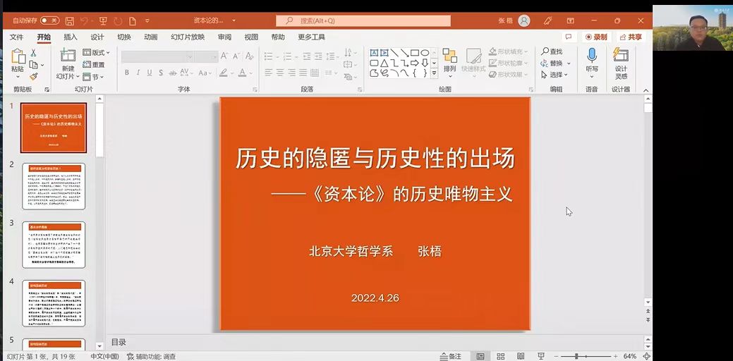 2022年4月26日晚,北京大学哲学系助理教授、博士生导师张梧应邀做吉林大学哲学社会学院名家系列讲座(第154场)。讲座题目为“历史的隐匿与历史性的出场——《资本论》的历史唯物主义”。本次讲座以线上腾讯会议形式举办,由吉林大学哲学社会学院教授、博士生导师李慧娟主持,白刚、王庆丰等多位教授参加了讲座。