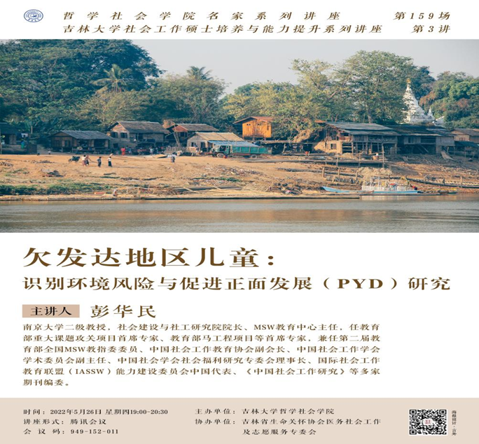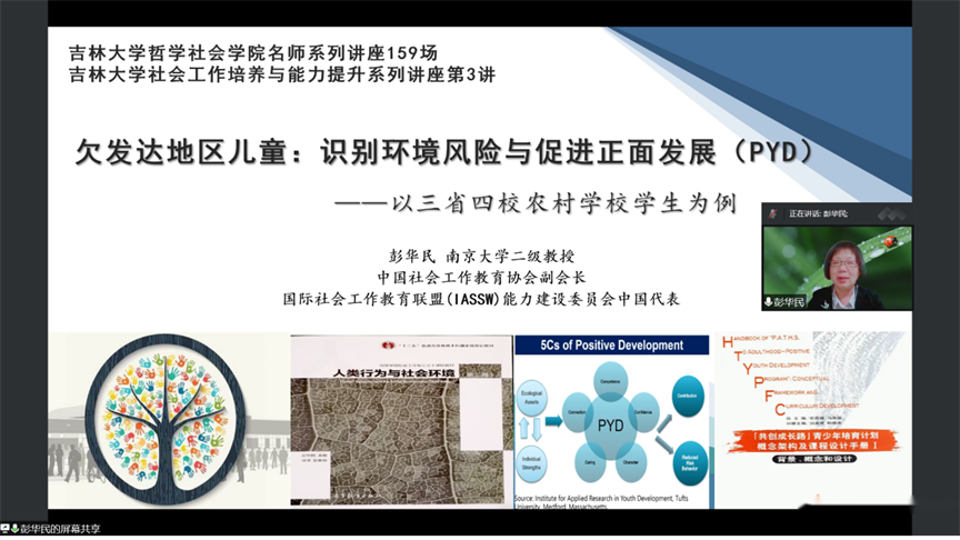 2022年5月26日19时,“哲学社会学院名家系列讲座”第159场,“吉林大学社会工作硕士培养与能力提升系列讲座”第3讲——《欠发达地区儿童:识别环境风险与促进正面发展(PYD)研究》,以线上会议的方式如期举行。该活动的协办单位为吉林省生命关怀协会医务社会工作及志愿服务专业委员会。本次讲座嘉宾是南京大学二级教授、博士生导师、社会建设与社工研究院院长彭华民老师,兼任教育部重大课题攻关项目首席专家、教育部马工程首席专家、第二届教育部全国MSW教指委委员、中国社会工作教育协会副会长、中国社会工作学会学术委员会副主任、中国社会学会社会福利研究专委会理事长、国际社会工作教育联盟(IASSW)能力建设委员会中国代表。本次讲座由副院长芦恒教授主持,院长田毅鹏教授及百余名师生线上参加了此次会议。