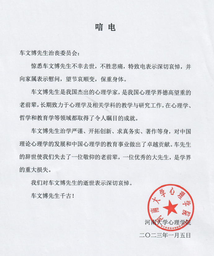 河南大学心理学院唁电