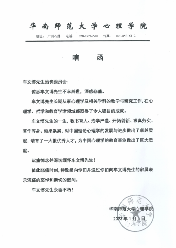 华南师范大学心理学院唁电