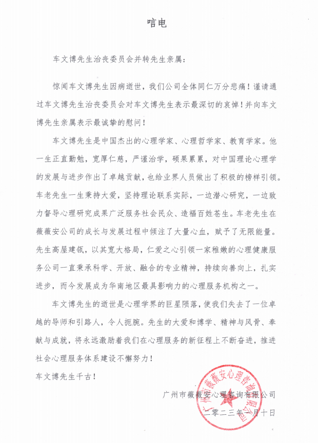 广州市薇薇安心理咨询有限公司唁电