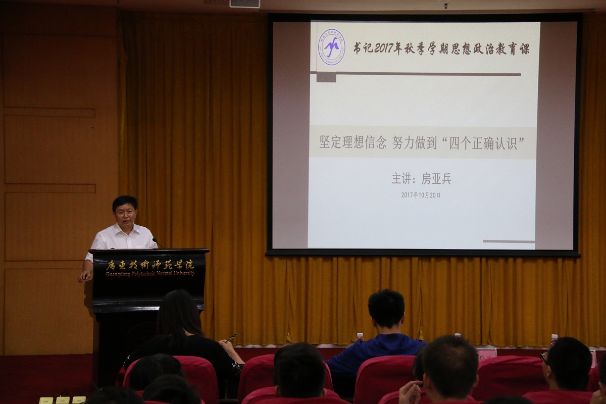 2017年10月20日在校本部第一教学楼208室,学院党总支房亚兵书记给学生干部和学生代表,作了题为《坚定理想信念,努力做到“四个正确认识”》的2017年书记秋季学期思想政治教育课。他以典型的历史资料为例,首先对理想信念的深刻内涵进行了深入讲解,认为当代大学生应把实现社会主义核心价值观培养成自己的理想信念。同时,结合学习党的十九大和全国高校思想政治工作会议精神,对大学生如何做到正确认识世界和中国发展大势、如何做到正确认识中国特色和国际比较、如何做到正确认识时代责任和历史使命、如何做到正确认识远大抱负和脚踏实地等问题进行了深入阐述。(数学与系统科学学院)