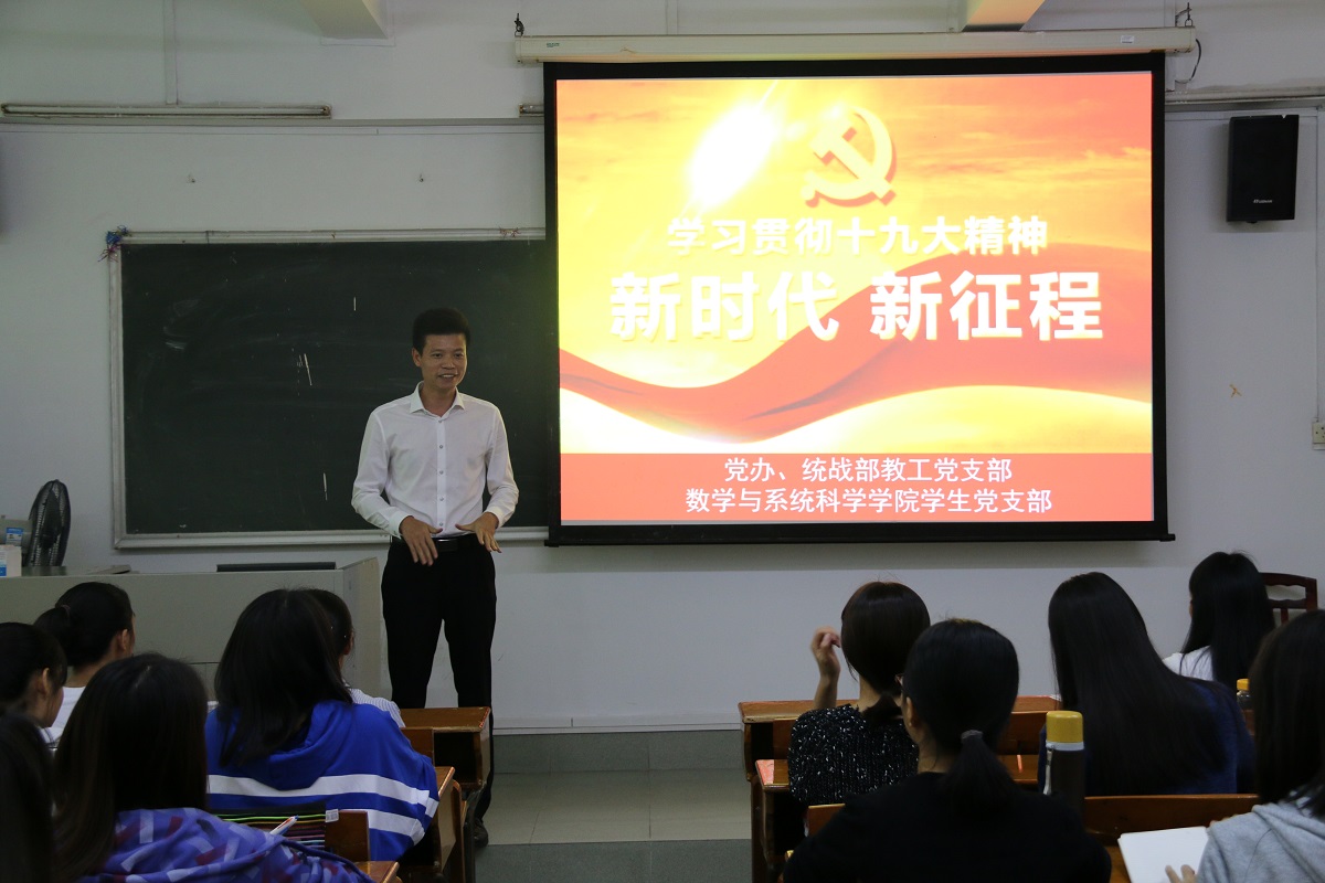 学生党支部书记陈远明要求全体学生党员、重点考察对象以及入党积极分子,要认真学习宣传贯彻党的十九大精神,全面准确学习领会十九大精神,将思想和行动统一到十九大精神上来。要不忘初心、牢记使命,坚定理想信念,争做合格的共产党员。(数学与系统科学学院)