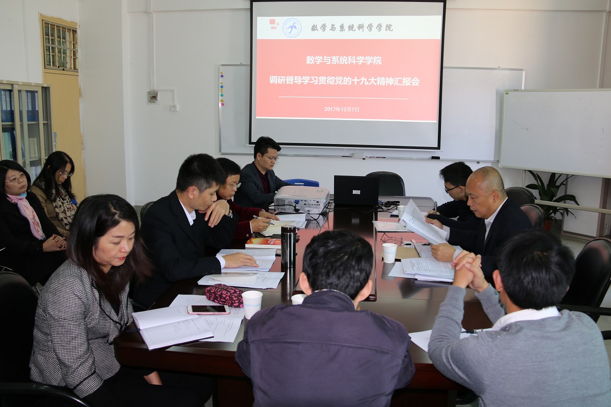 12月7日下午,潘自勉副院长到数学与系统科学学院调研督导学习贯彻党的十九大精神工作。调研汇报会在校本部一教1211室举行,数学与系统科学学院党政领导班子成员、系(部)主任、党支部书记和教师代表出席了汇报会。