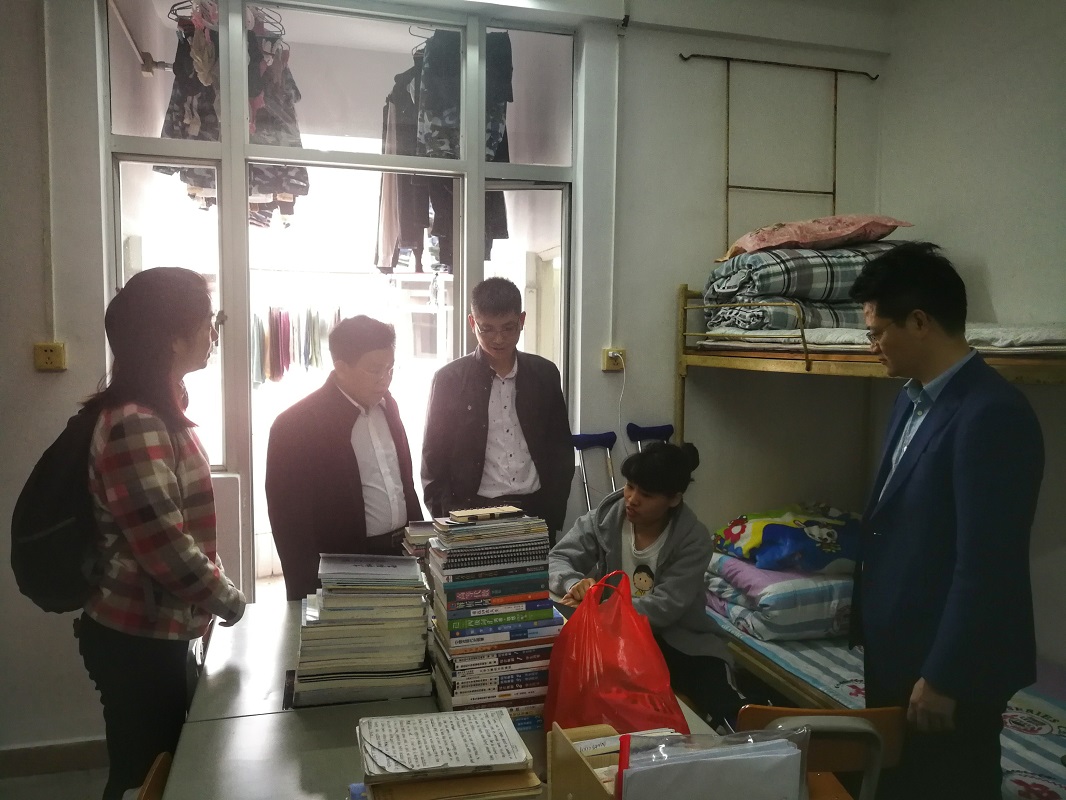 1月5日中午,学院领导房亚兵、梁海华、赵珲、游志福,以及辅导员陈远明老师,前往看望军训受伤的2017级数学与应用数学(师范)2班王俊慧同学,带去师生的问候,并送上慰问品。(数学与系统科学学院)