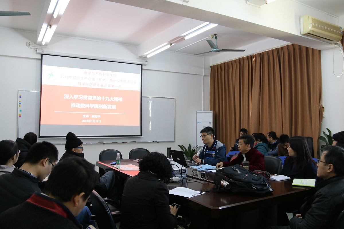 2018年1月11日下午,在校本部一教1211室,数学与系统科学学院举行党总支中心组(扩大)2018年第一次专题学习会暨学院创新发展论坛第一讲。学院中心组成员及骨干教师代表出席了会议。会议由党总支书记房亚兵主持。