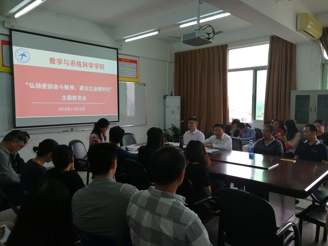 2018年11月15日下午,在校本部1211室,数学与系统科学学院召开“弘扬爱国奋斗精神,建功立业新时代”主题教育会,全体教师出席了会议。当日下午,教工第一、第二党支部召开支部会议,再深入研讨,针对党员如何发挥率先垂范作用等问题,谈了自己的想法。