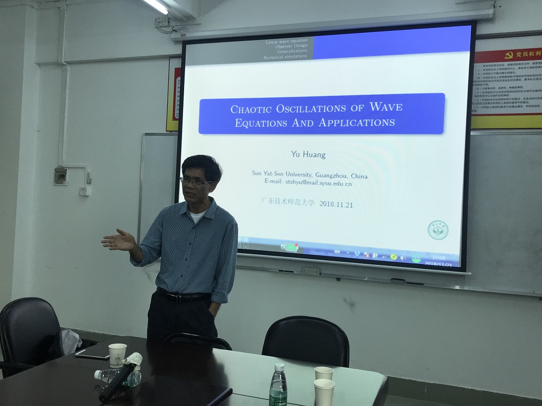 2018年11月21日下午,美国德克萨斯A&M大学(Texas A&M University)的Goong Chen 教授和中山大学黄煜教授应邀到我院作学术报告。报告会在校本部第一教学楼1211室举行。学院领导梁海华,以及对此课题方向感兴趣的老师、研究生、本科生参加了报告会。