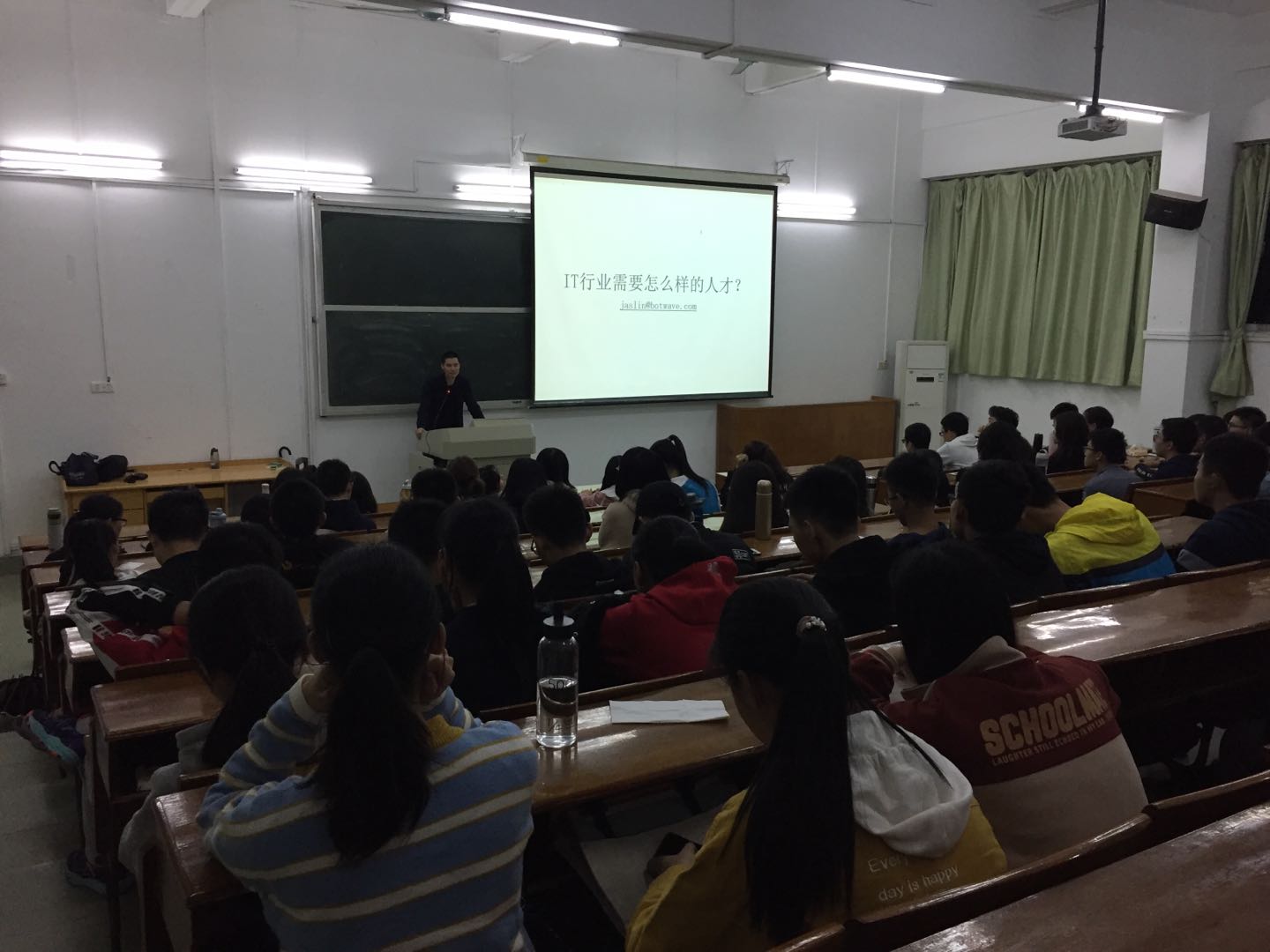 12月7日晚,受我院信息与计算科学系系主任朱志强教授邀请,广州博汇数码科技有限公司的首席技术官林霖先生,在一教207课室为信计学生做了“IT企业需要什么样的人才”的主题讲座。结合自己的专业背景,林经理向学生介绍了当前信息领域的技术需求,以及涉及的专业知识,很好地展示了理论与实践的关系,并着重强调了打好基础的重要性。讲座的后阶段为交流环节,信计学生就自己关心的问题踊跃向林经理提问,问及的话题有:如何“翻墙”,哪门计算机语言更重要,面试是否很看重实践经验,Python的重要性,等等。