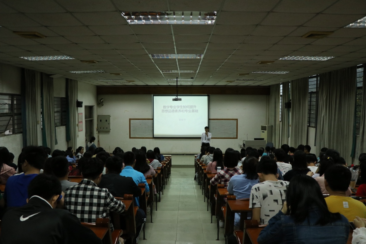 5月8日下午,我院党总支副书记、院长梁海华教授在校本部实验楼107室为2018级数学与应用数学(师范)、信息与计算科学专业学生上了一堂题为《数学专业学生如何提升思想品德素养和专业基础》的思想政治课。