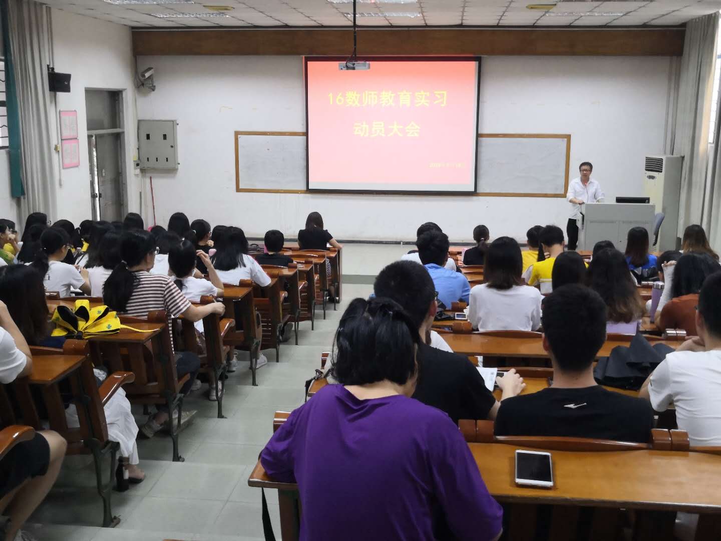 2019年5月14日16数师1班,16数师2班教育实习动员大会在实验楼107课室举行。数学与系统科学学院主管学生工作的赵珲副书记,数学与应用数学系主任肖黎明教授参加了实习动员大会。大会由肖黎明教授主持。赵珲副书记就教育实习期间的安全问题,面对实习学校师长的礼貌问题,实习期间的着装问题对16数师2个班的同学提出了相应要求。肖黎明主任对教育实习的目的和意义,教育实习期间的遵纪、守时、安全问题对16数师的同学也作出了相应要求,并对教育实习期间每一位同学需要做的工作做了详细的布置。