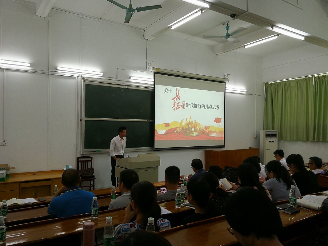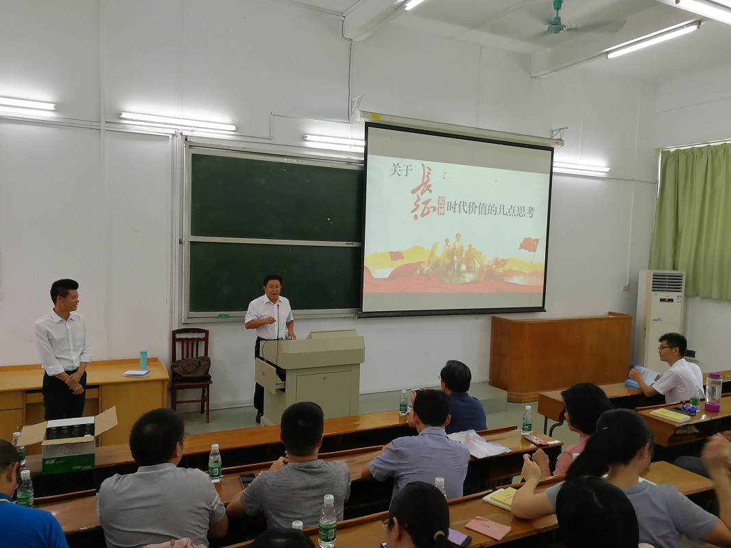 2019年9月26日,为贯彻落实学校“不忘初心、牢记使命”主题教育实施方案,组织好革命传统教育,加强广大师生对党史、新中国史的学习,数学与系统科学学院党总支和民族学院党总支在校本部第一教学楼207室联合举办“不忘初心、牢记使命”主题教育专场报告会,报告会由民族学院党总支书记黄文浩作“关于长征精神时代价值的几点思考”专题报告。数学与系统科学学院全体教工党员参加了本次活动。报告会由数学与系统科学学院党总支书记房亚兵主持。