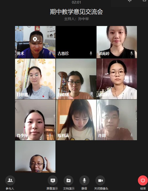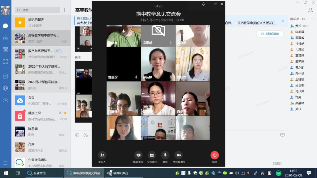 2020年5月8日,数学与系统科学学院高等数学部,由孙中举、黄术、吴世枫三位老师分别与相关班级的学委,通过建立企业微信群、钉钉群视频会议,了解本学期高等数学线上教学的实施、交流期中线上教学效果、线上课堂教学规范、教学进度及授课质量等情况;讨论在线辅导答疑、在线学习讨论、学生出勤、作业布置批改等情况,展望下半学期高等数学线上教学的相关工作。