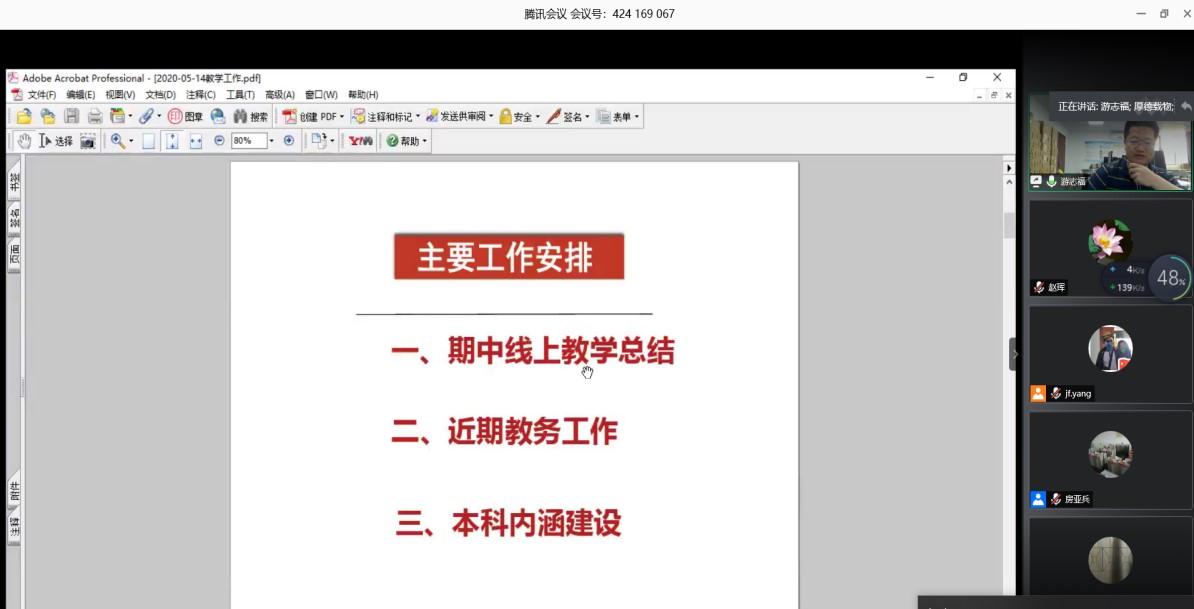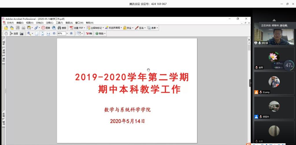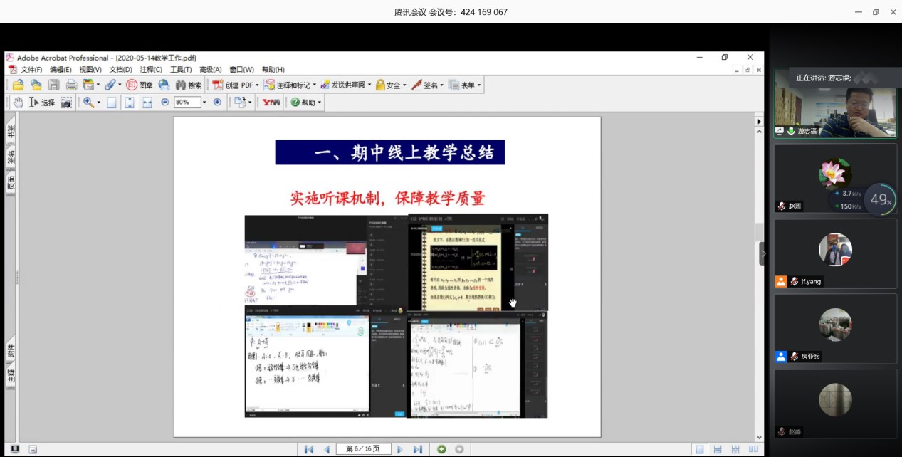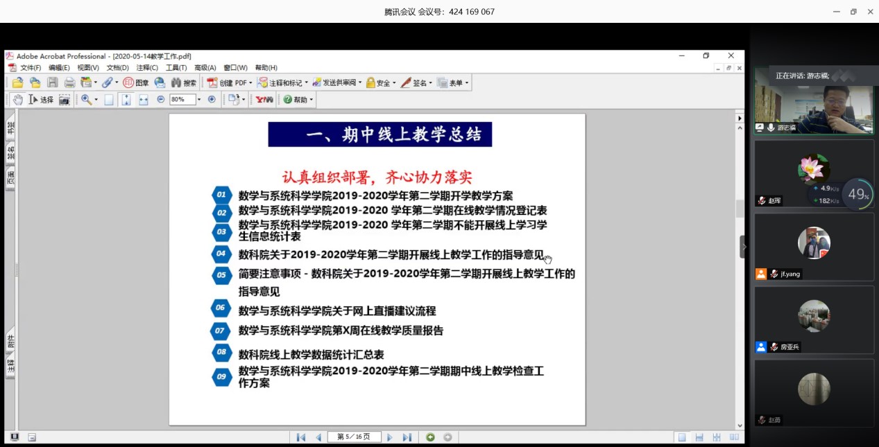 2020年5月14日下午三点,数学与系统科学学院在腾讯会议平台,召开了本学期期中本科线上教学工作会议。会议围绕本学期期中线上教学总结、近期教务工作、本科内涵建设等方面展开深入交流以及探讨: