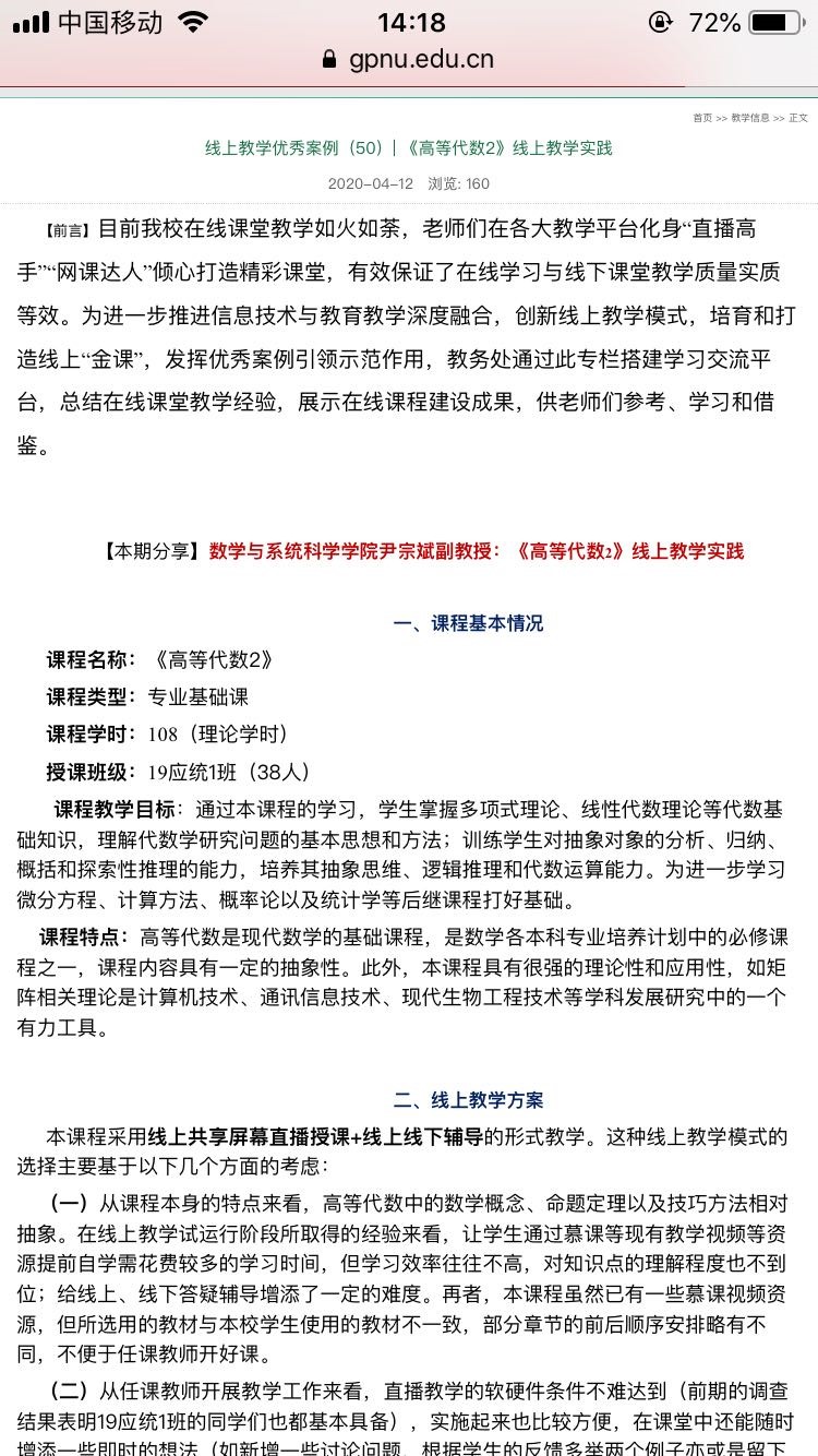 教师严格按照课表的时间上课,没有迟到早退现象。教师已经熟练掌握各种平台直播或录播课程,取得较好效果。每节课,教师都有习题答疑、布置作业或思考题。大部分教师能和学生互动,并注重学生的参与和反馈。