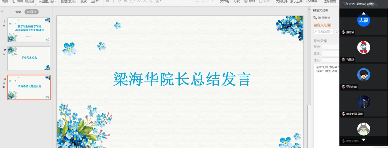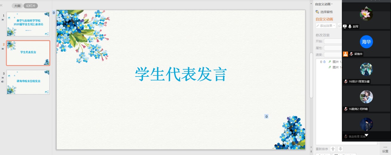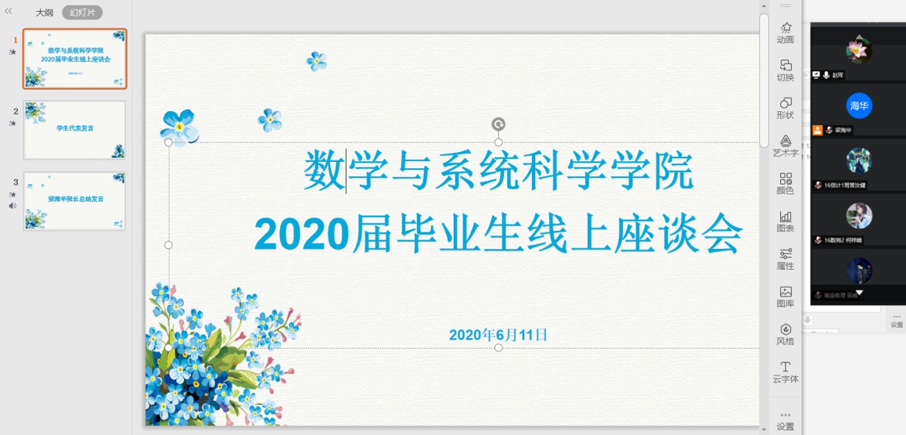 2020 年 6 月 11日下午16:00,数学与系统科学学院在腾讯会议召开2020届毕业生线上座谈会。学校教务处和学院非常重视此次座谈会,教务处吴秀兰副处长全程参与指导,学院党政班子成员、数学与应用数学系主任及专业负责人、信息科学与计算系主任及专业负责人、应用统计系主任及专业负责人、辅导员参加会议。会议由党总支副书记赵珲主持。