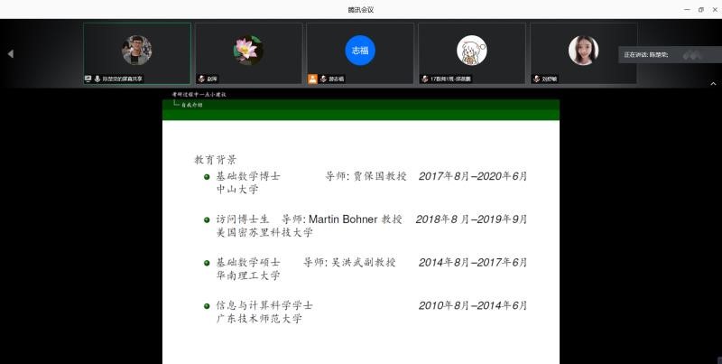 本次会议邀请了三位优秀校友,他们是:2014届优秀校友陈楚荣博士,他本科毕业于广东技术师范学院信息与计算科学专业,考取了华南理工大学的硕士和中山大学的博士,发表了多篇高质量SCI论文;2020届优秀毕业生萧灿荣,他考取了深圳大学硕士研究生;2020届优秀毕业生刘舒敏,她考取了华南师范大学硕士研究生;出席此次会议的我院领导和老师有:学院党总支赵珲副书记;副院长游志福教授;信息与计算科学系主任朱志强教授;数学与应用数学专业负责人陈玉明副教授、应用统计系主任陈志景副教授,以及辅导员王婷婷、亚地卡尔老师。