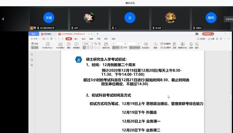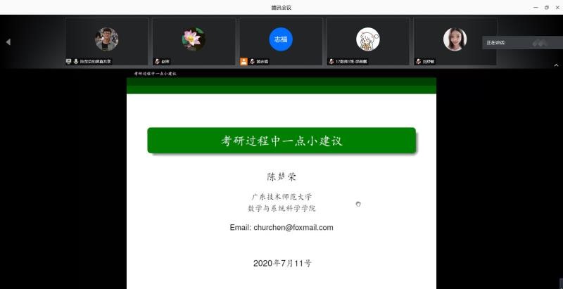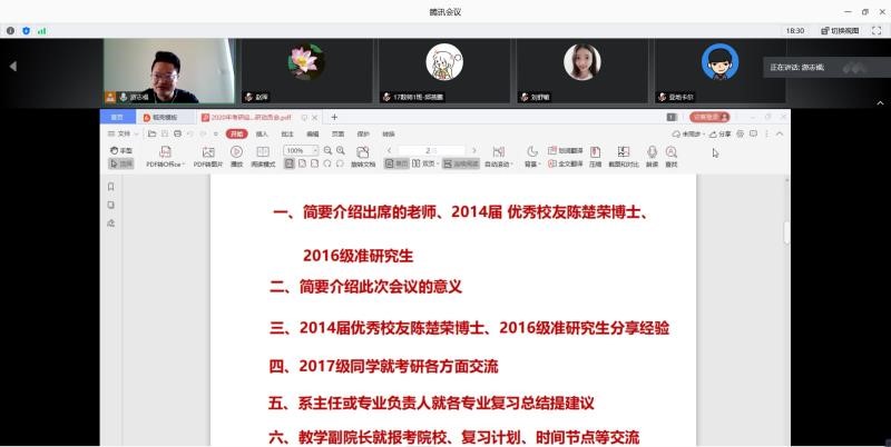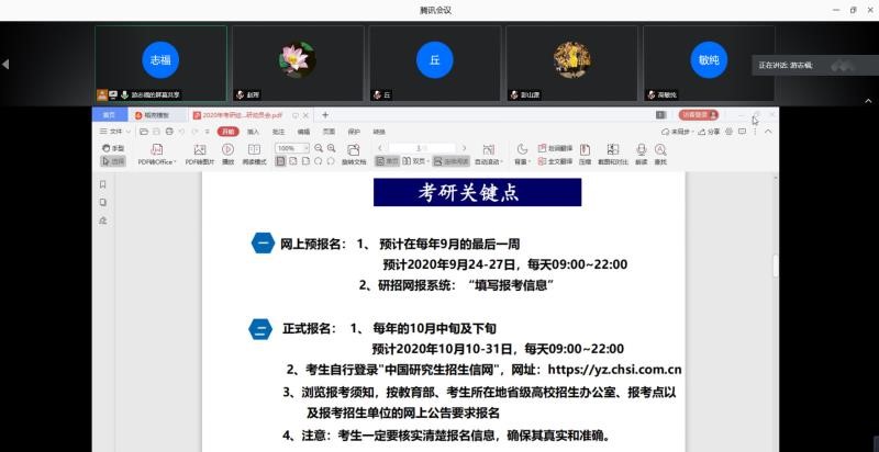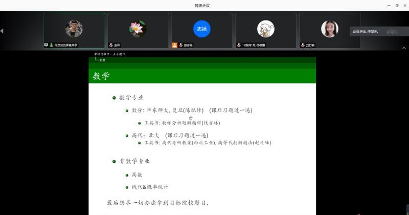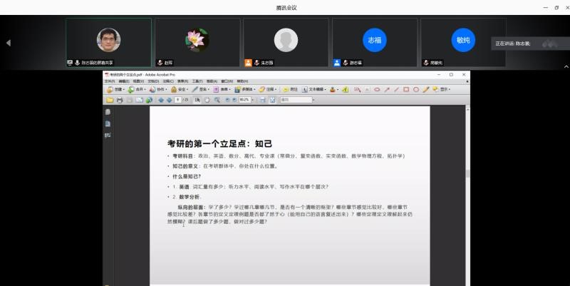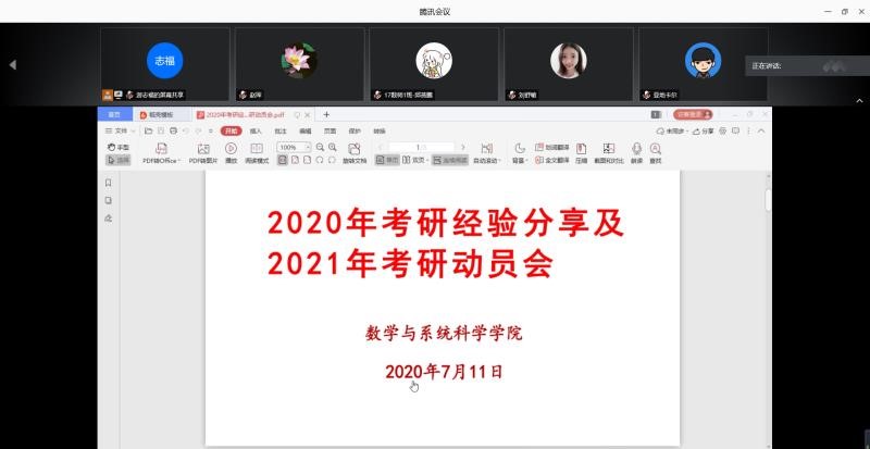 2020年7月11日,数学与系统科学学院在腾讯会议平台召开2020年考研经验分享和2021考研动员会,就学习心态、复习计划、复习方法、考研时间节点等方面和2017级考研同学交流,举全学院之力帮助同学们参加2021年考研。