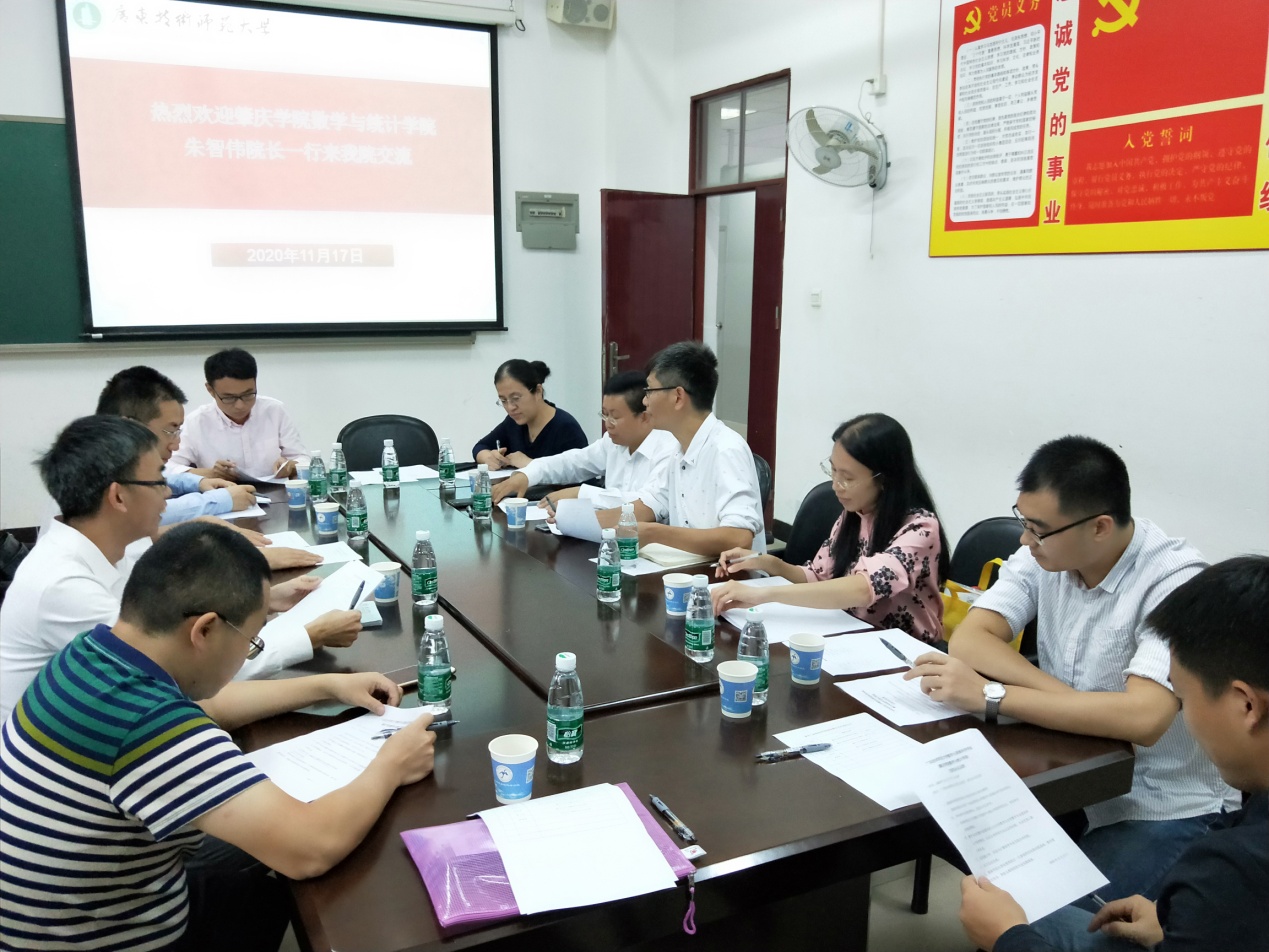 11月17日,肇庆学院数学与统计学院朱智伟院长、符和满副院长、吴晓副院长等一行7人到我院交流访问。我院院长梁海华、党总支书记房亚兵、数学与应用数学系主任黄凤英及专业负责人陈玉明、信息与计算科学专业负责人陈艳美参加了座谈。