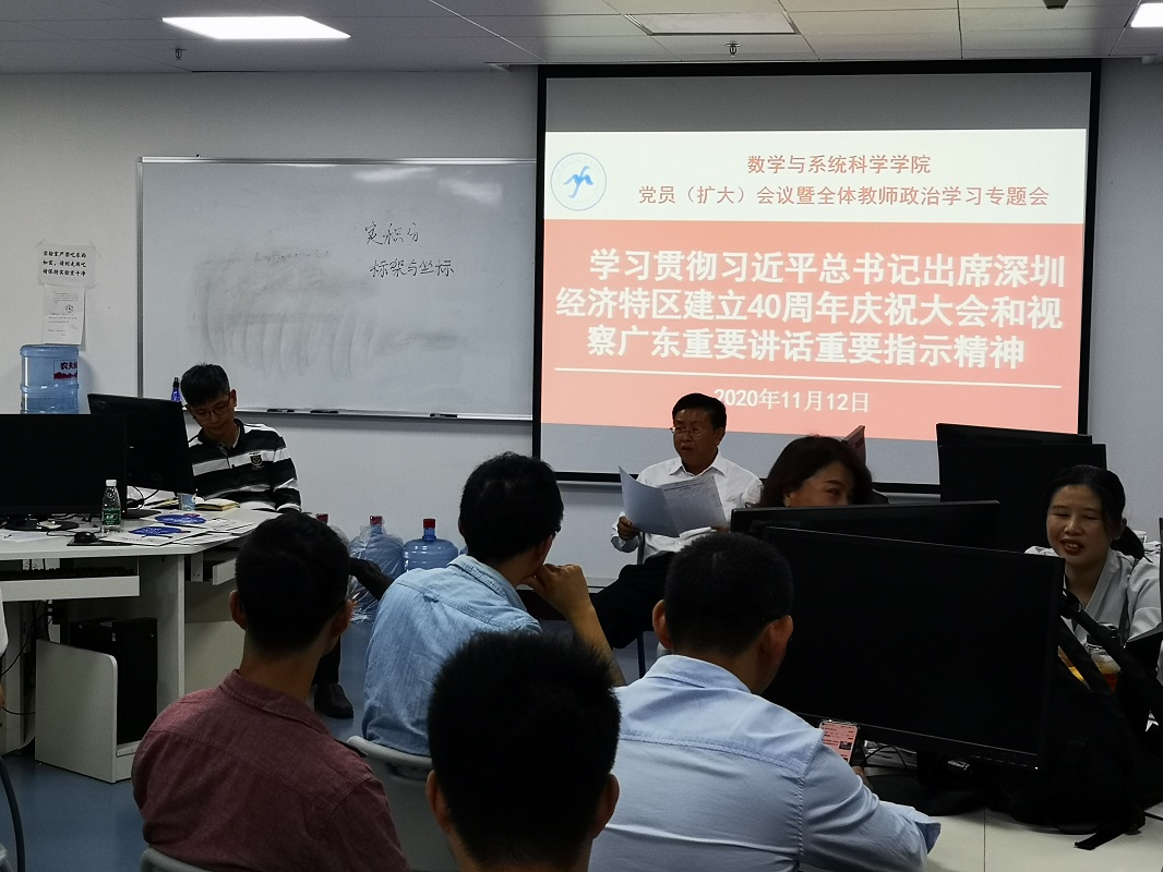 2020年11月12日下午,在东校区工业中心506,我院召开党员(扩大)会议暨全体教师政治学习专题会,传达学习贯彻习近平总书记出席深圳经济特区建立40周年庆祝大会和视察广东重要讲话重要指示精神。