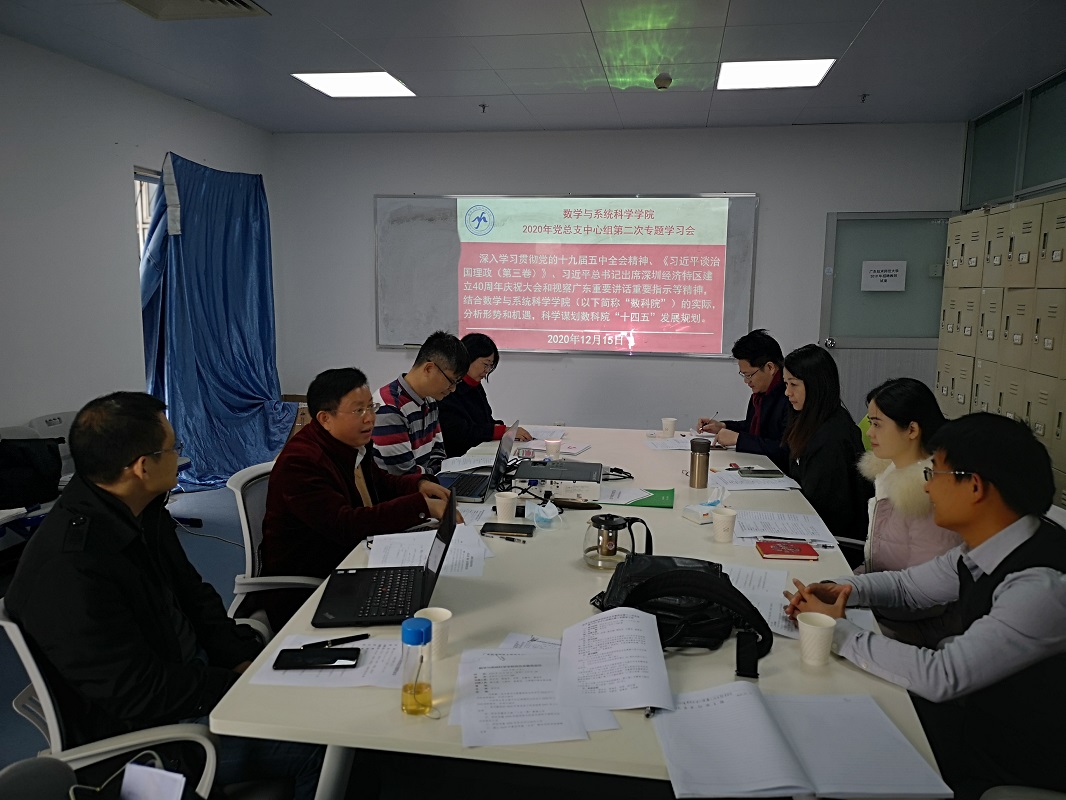 学习主题是:深入学习贯彻党的十九届五中全会精神、《习近平谈治国理政》第三卷、习近平总书记出席深圳经济特区建立40周年庆祝大会和视察广东重要讲话重要指示等精神,结合数学与系统科学学院的实际,分析形势和机遇,科学谋划“十四五”发展规划。