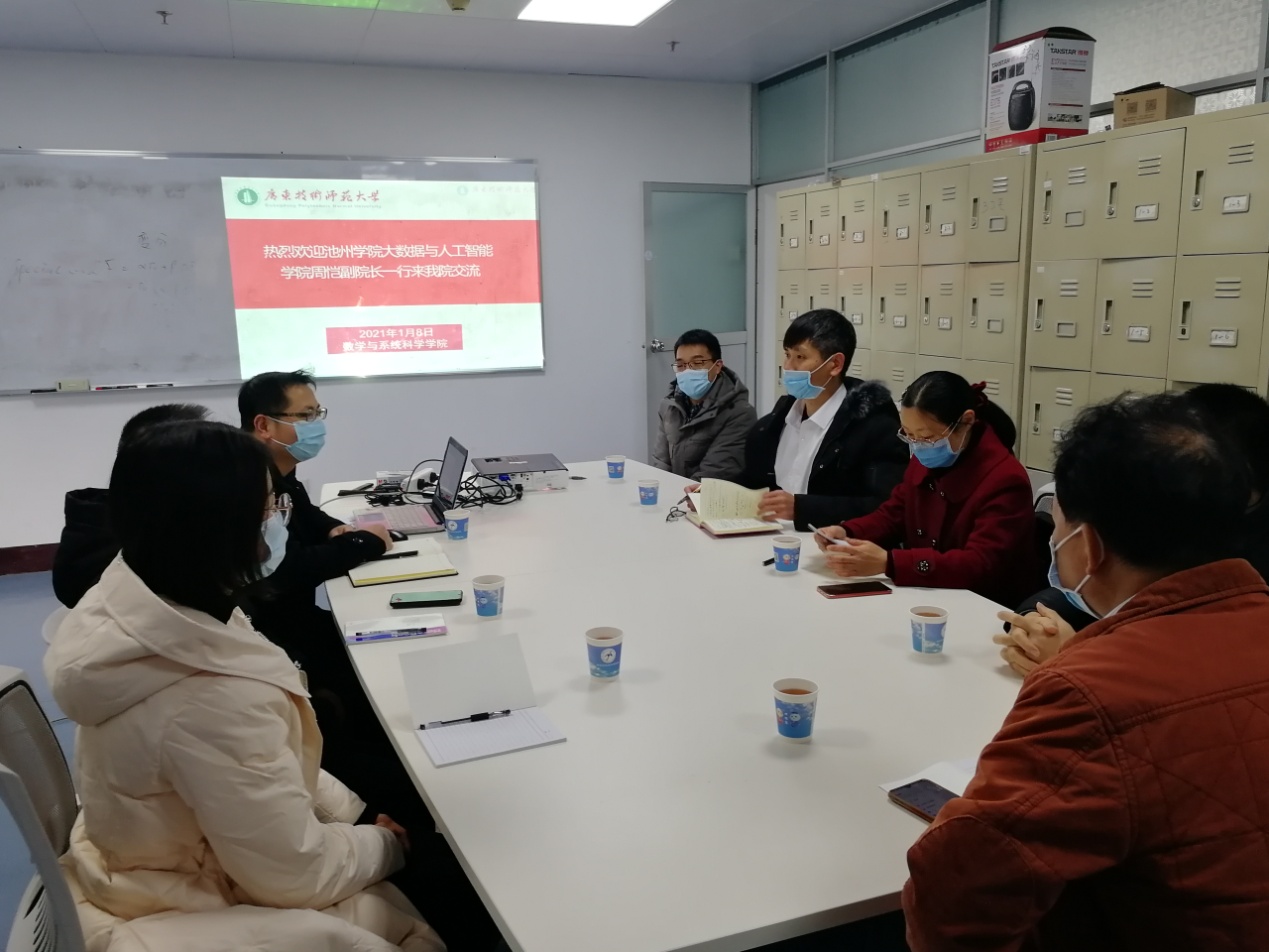 2021年1月8日,安徽省池州学院大数据与人工智能学院周恺副院长、数学与应用数学专业负责人高芳、数学学科带头人李小新等一行人到我院交流访问。我院院长梁海华、数学与应用数学专业负责人陈玉明、学院教师陈月红、尹宗斌参加了座谈。
