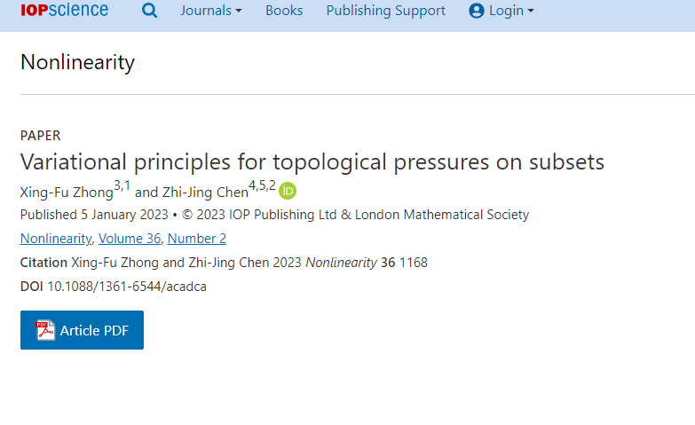 2023年1月5日,我院陈志景副院长与广东外语外贸大学的钟兴富副教授合作在业内知名期刊《Nonlinearity》的第36卷第2期发表了论文“Variational principles for topological pressures on subsets”。