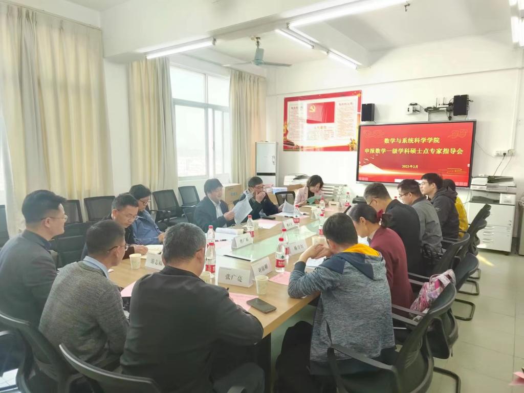 2月16日下午,数学与系统科学学院在学校东校区第一教学楼1112室召开了申报数学一级学科硕士点专家指导会。会议特邀广东省数学会理事长、粤港澳大湾区国家数学中心姚正安教授,国家杰出青年基金获得者、华南理工大学数学学院学术院长朱长江教授,首届国家教学名师、广州大学曹广福教授等三位校外专家,我校校长戴青云教授、研究生院院长陈泳竹教授等二位校内专家出席会议。数学与系统科学学院全体领导班子成员及学术骨干代表参会。会议由数学与系统科学学院梁海华院长主持。