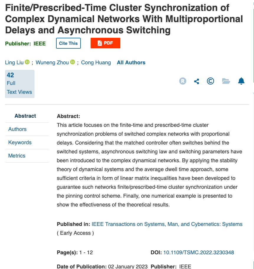 2023年1月2日,我院刘玲老师与东华大学的周武能教授合作在业内知名期刊《IEEE Transactions on Systems, Man, and Cybernetics: Systems》的发表了论文“Finite/prescribed-time cluster synchronization of complex dynamical networks with multi-proportional delays and asynchronous switching”。