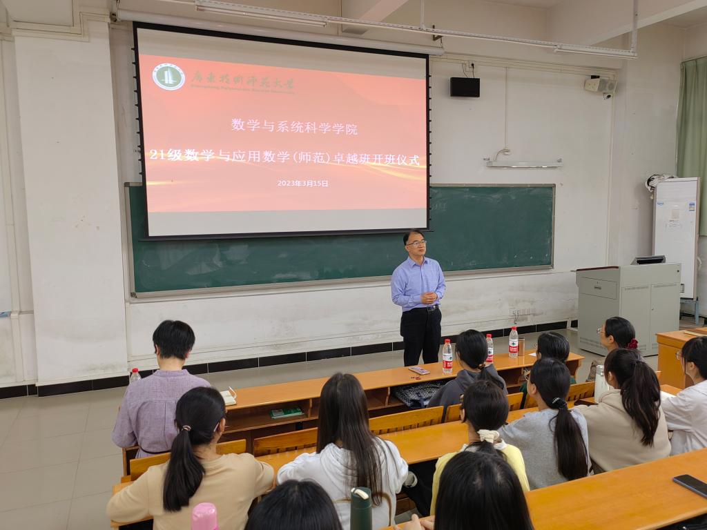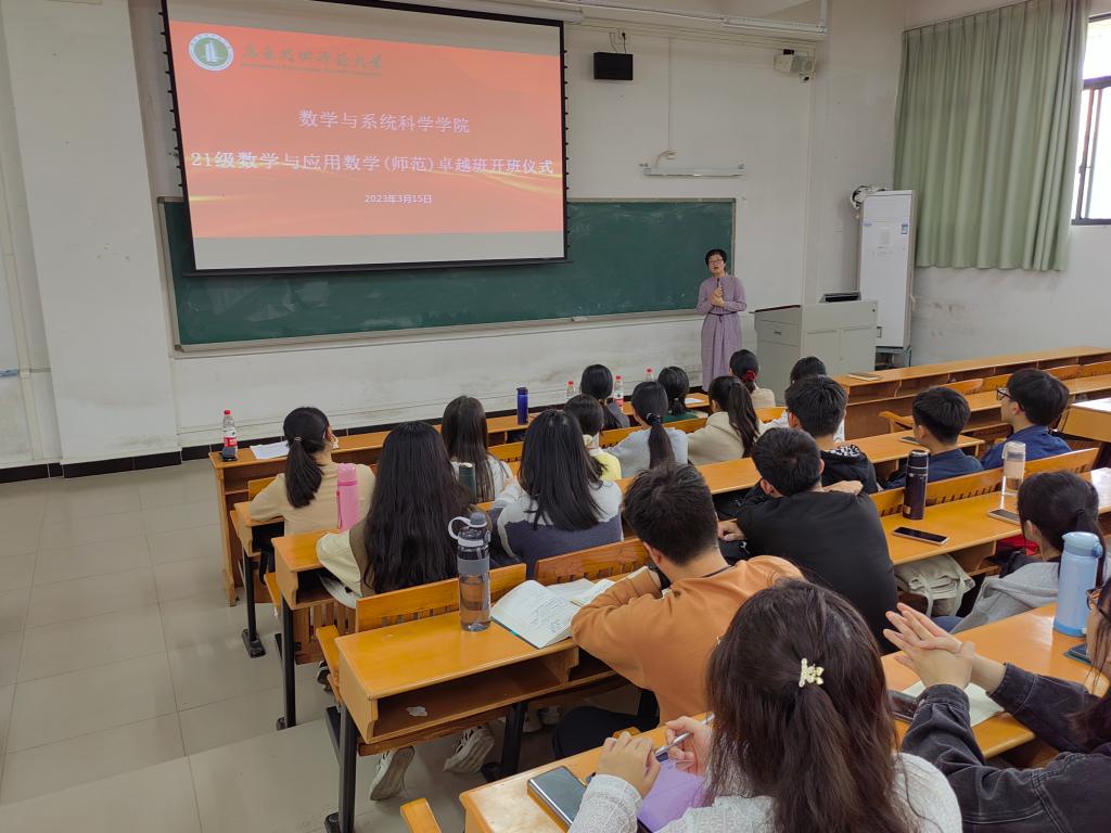 数学与系统科学学院2021级数学与应用数学(师范)卓越教师班(以下简称2021级数师卓越班)于3月15日在白云校区三教108教室举行开班仪式。数学与系统科学学院党委书记白雪飞、副书记许国良、副院长陈月红、数学系副主任王燕、2020级卓越班班主任付辉及2021级数师卓越班全体同学出席了本次仪式。