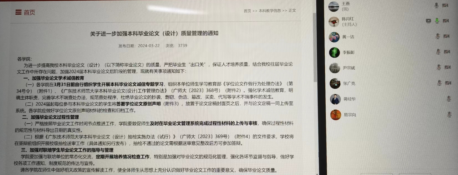 2024年3月29日,数学与系统科学学院召开2024届本科毕业论文(设计) 工作专题线上会议,会议由学院教学副院长陈月红主持,学院毕业设计工作小组全体成员和教务员参加本次会议。陈院长首先向与会小组成员传达学校关于加强本科毕业论文(设计)质量管理的最新通知,强调加强毕业论文学术诚信教育和加强毕业论文过程性管理。