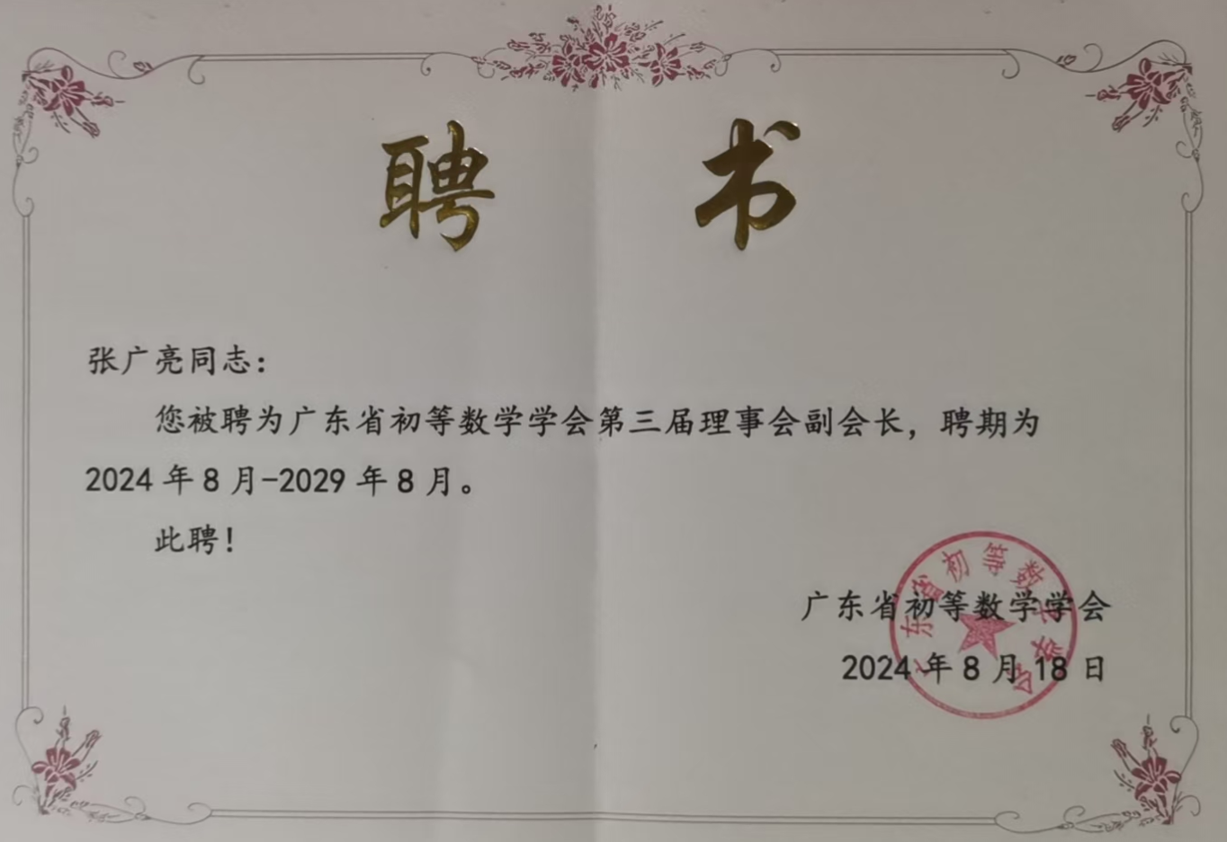 张广亮当选为广东省初等数学学会第三届理事会副会长,将进一步拓展我院与广东省中小学数学教育教学行业的联系,促进我院数学与应用数学专业人才培养的高质量发展。