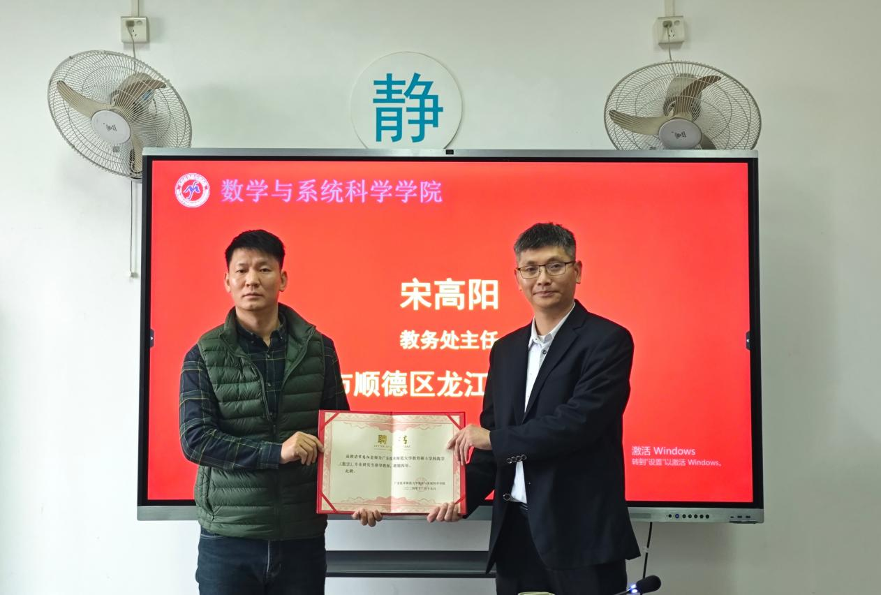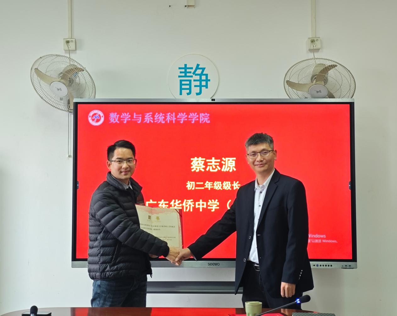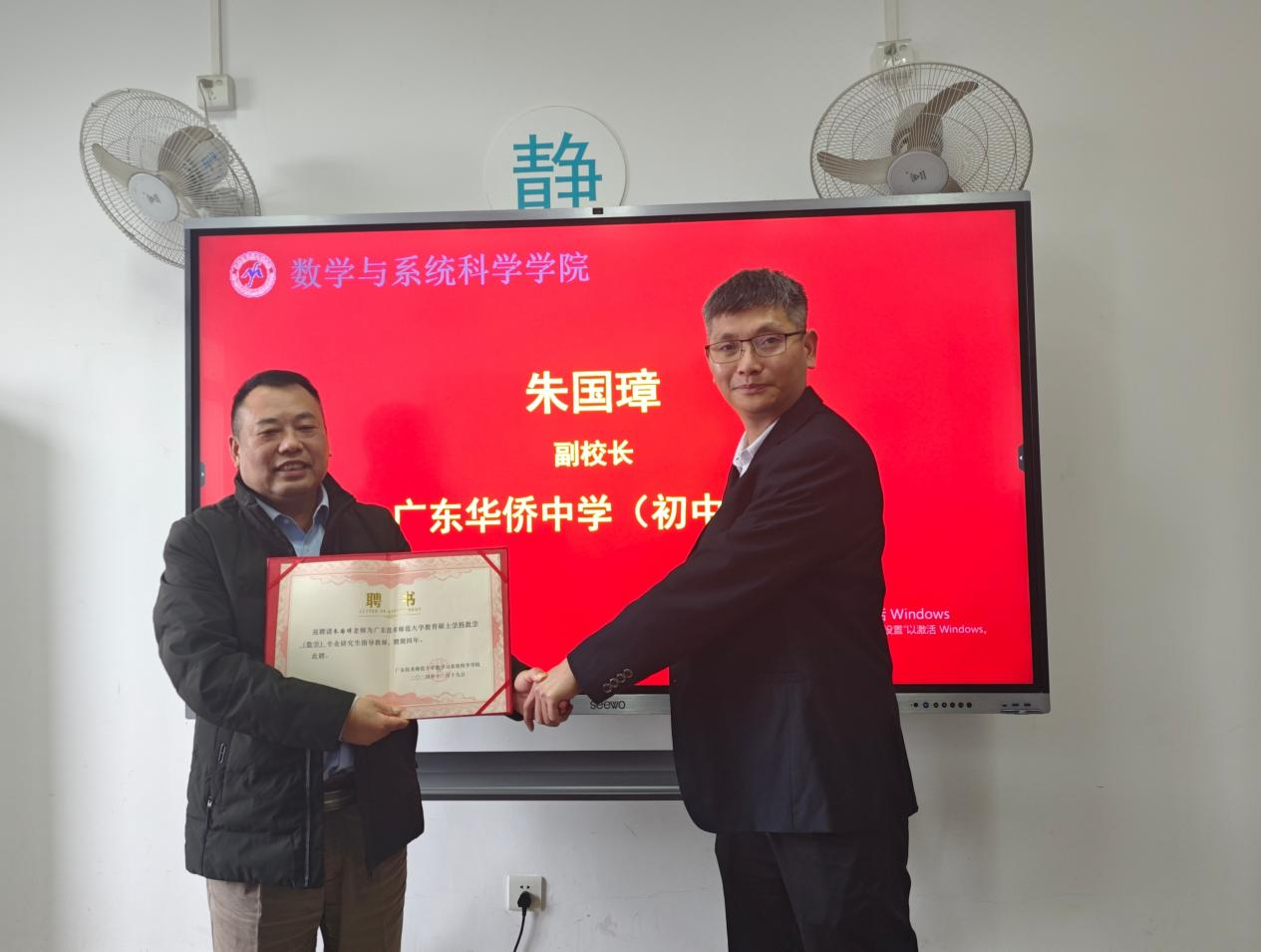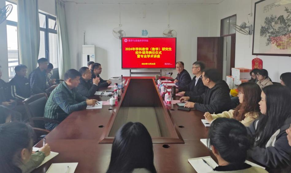 2024年12月26日下午,我院在白云校区第一教学楼602会议室举行2024年学科教学(数学)研究生校外硕导聘任仪式暨专业学术讲座。我院院长梁海华、副书记许国良、广东华侨中学(初中部)副校长朱国璋、广东华侨中学(初中部)初二年级级长蔡志源、佛山市顺德区龙江外国语学校教务处主任宋高阳以及我院2023级学科教学(数学)全体研究生、2024级研究生代表参加了会议,会议由许国良副书记主持。