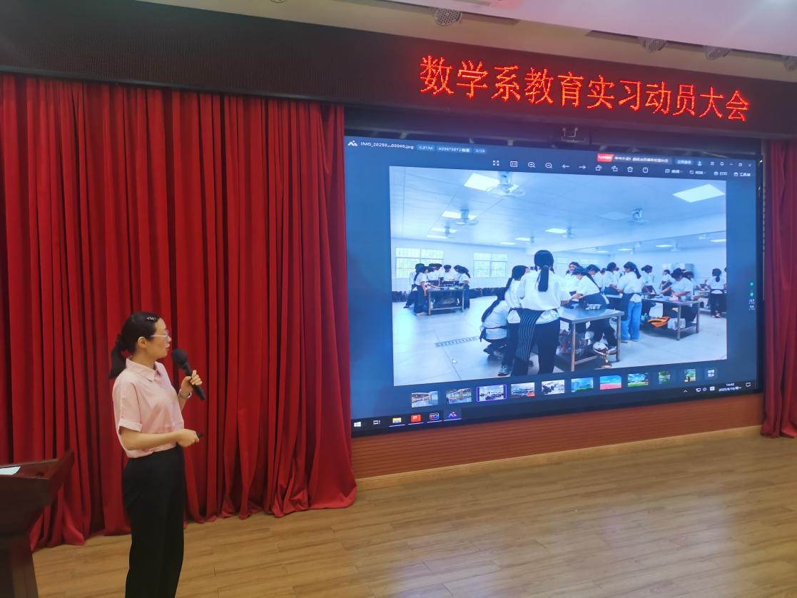 数学系副主任黄术在会上介绍了本次教育实习的安排与特点,并对学生提出实习要求:一.要迅速转换角色,做好心理和专业准备;二.要认真负责,珍惜实践机会,提升教学能力和职业素养;三.要积极配合学院管理,严格遵守实习纪律;四.要妥善解决实习中遇到的问题;五.鼓励积极报名参加粤东、粤西、粤北地区(如仁化、河源等地)实习点,为当地教育贡献力量,同时拓宽视野和职业发展路径。