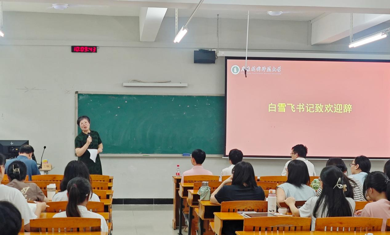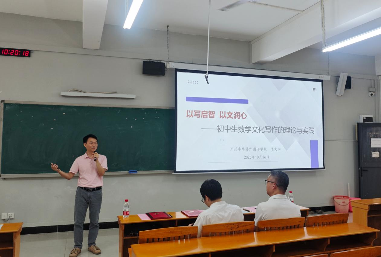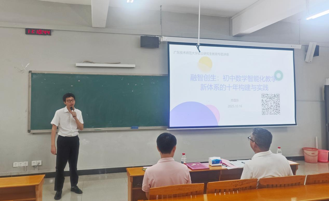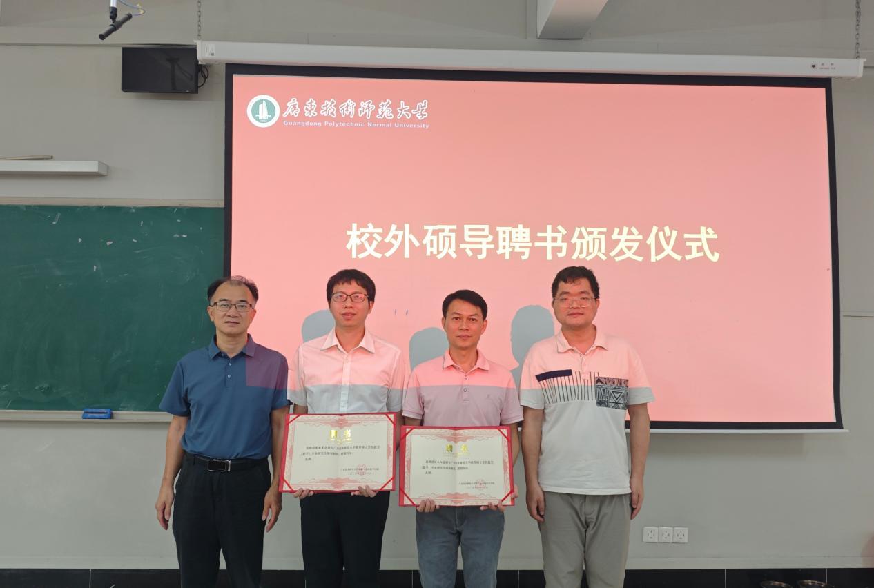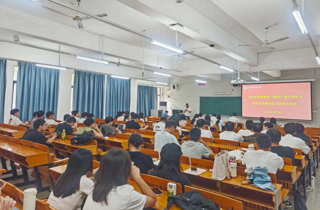 2025年10月16日上午,我院在白云校区第三教学楼106室举行2025年学科教学(数学)方向硕士研究生校外导师聘任仪式暨学术讲座。我院党委书记白雪飞、副书记许国良、副院长陈志景、数学系系主任张广亮、广州市真光中学苏国东老师、广州市华侨外国语学校陈文阳老师,以及我院教师代表、2024级与2025级学科教学(数学)方向硕士研究生、2023级数学与应用数学(师范)卓越班全体学生参加了会议。会议由张广亮主任主持。