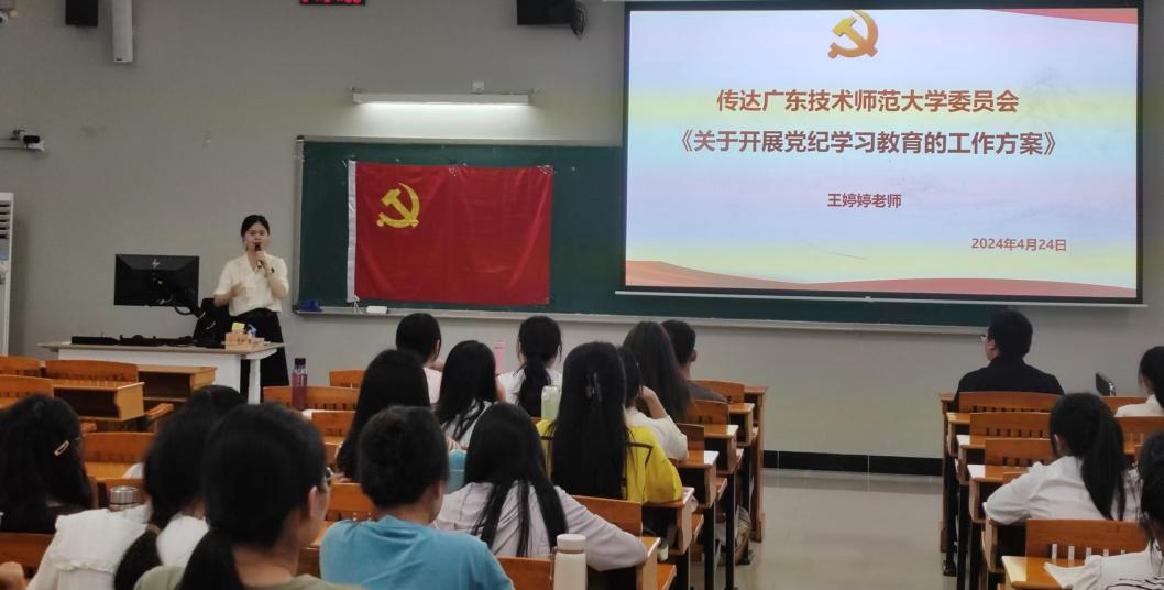 本科生党支部书记王婷婷老师传达广东技术师范大学委员会《关于开展党纪学习教育的工作方案》。