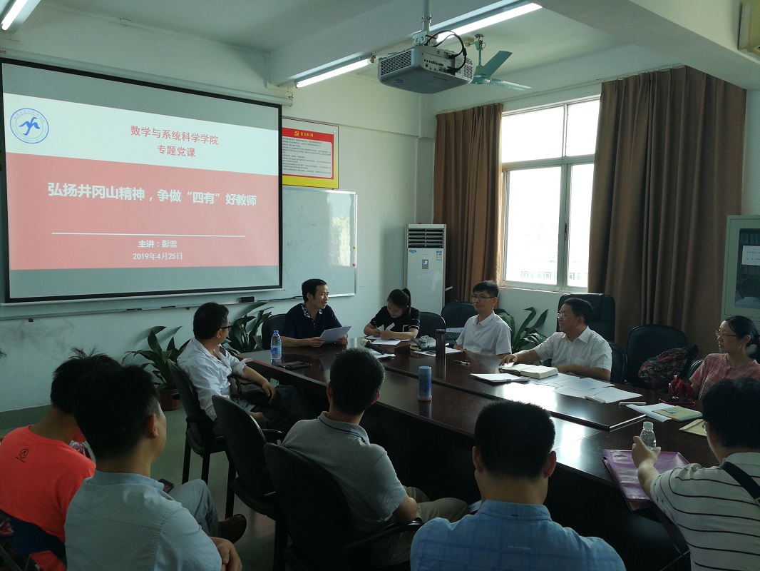 2019年4月25日下午,在校本部一教1211室,数学与系统科学学院教工第一党支部召开全体党员会议。会议内容:彭雪书记以《弘扬井冈山精神,争做“四有”好老师》为题,给党员上专题党课。